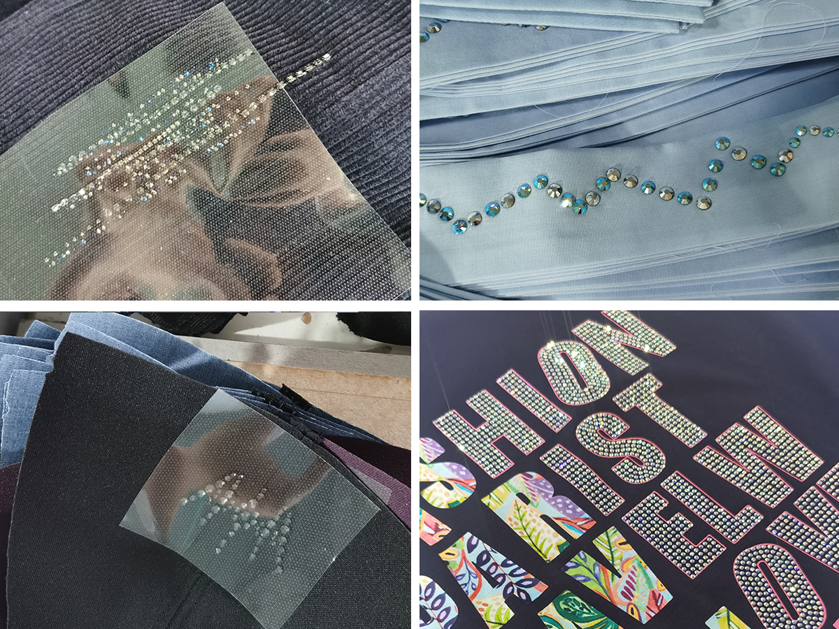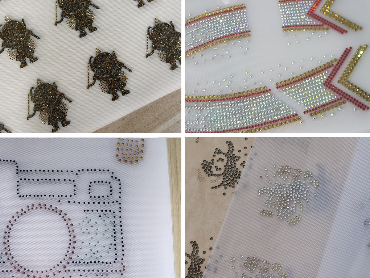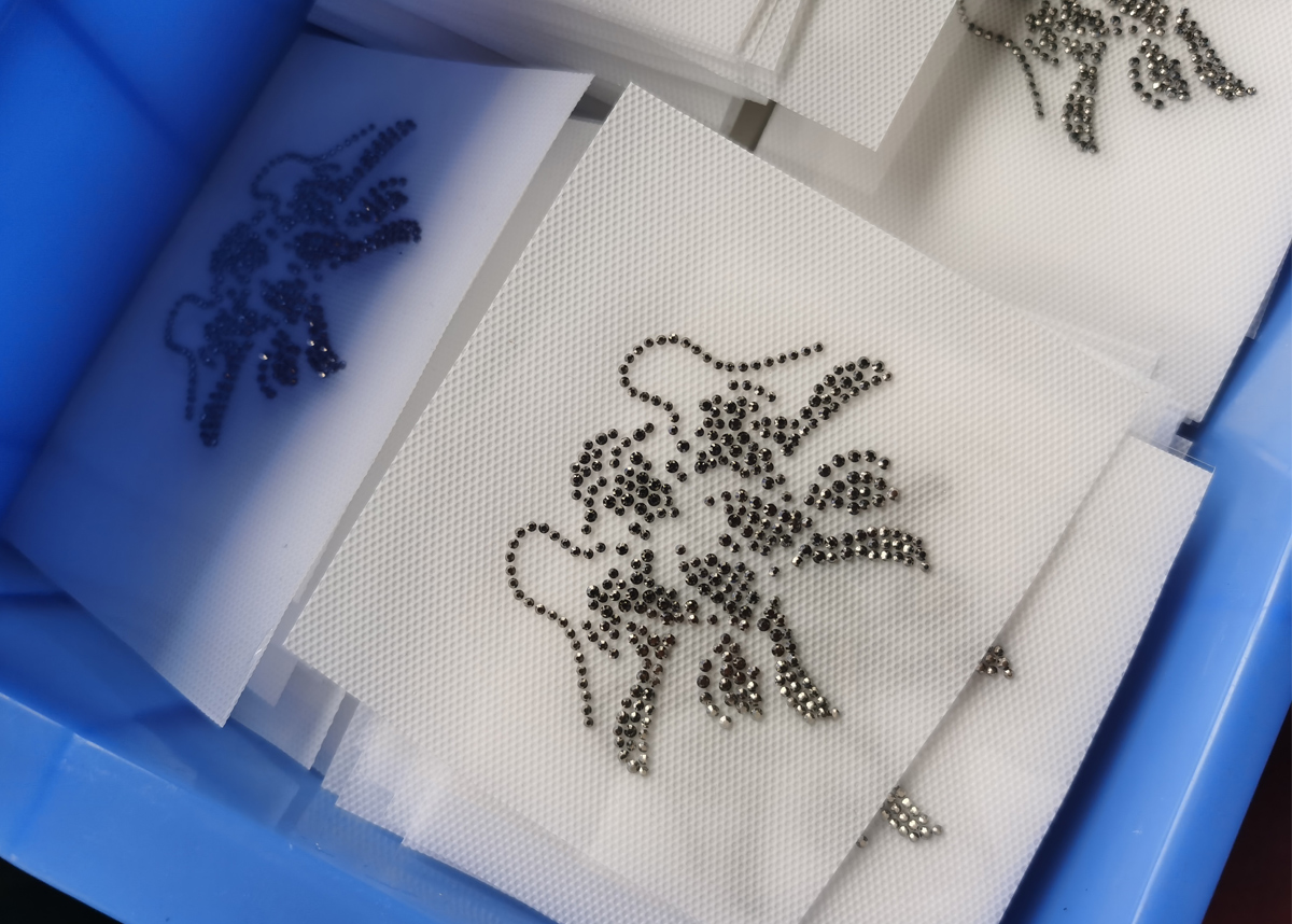 1. Hotfix Rhinestone Transfer: We craft rhinestone patterns from loose hotfix stones, based on clients' creative designs.