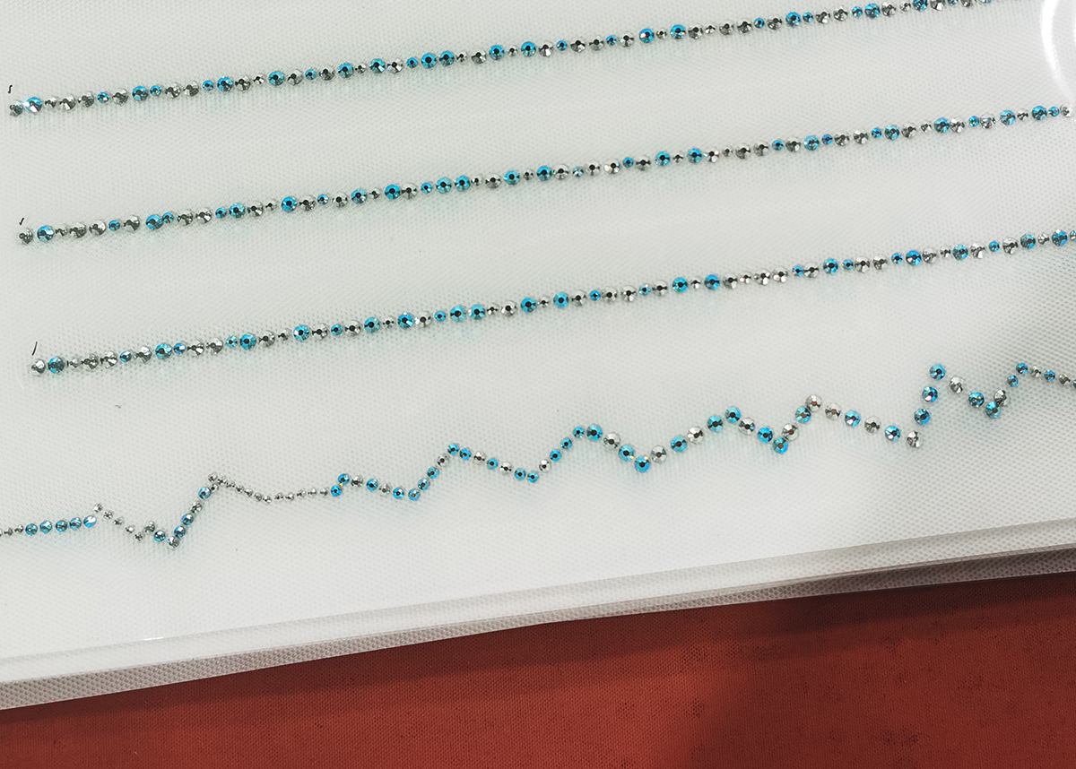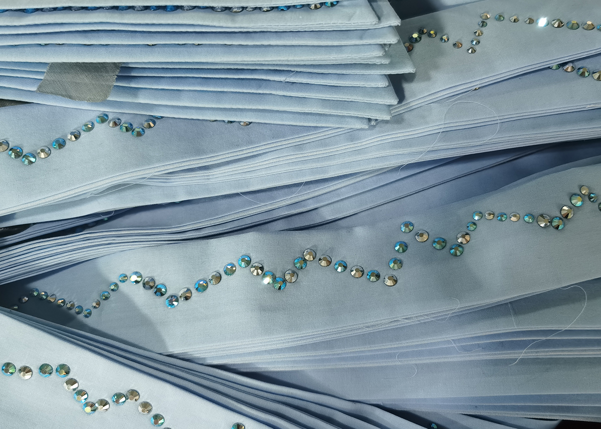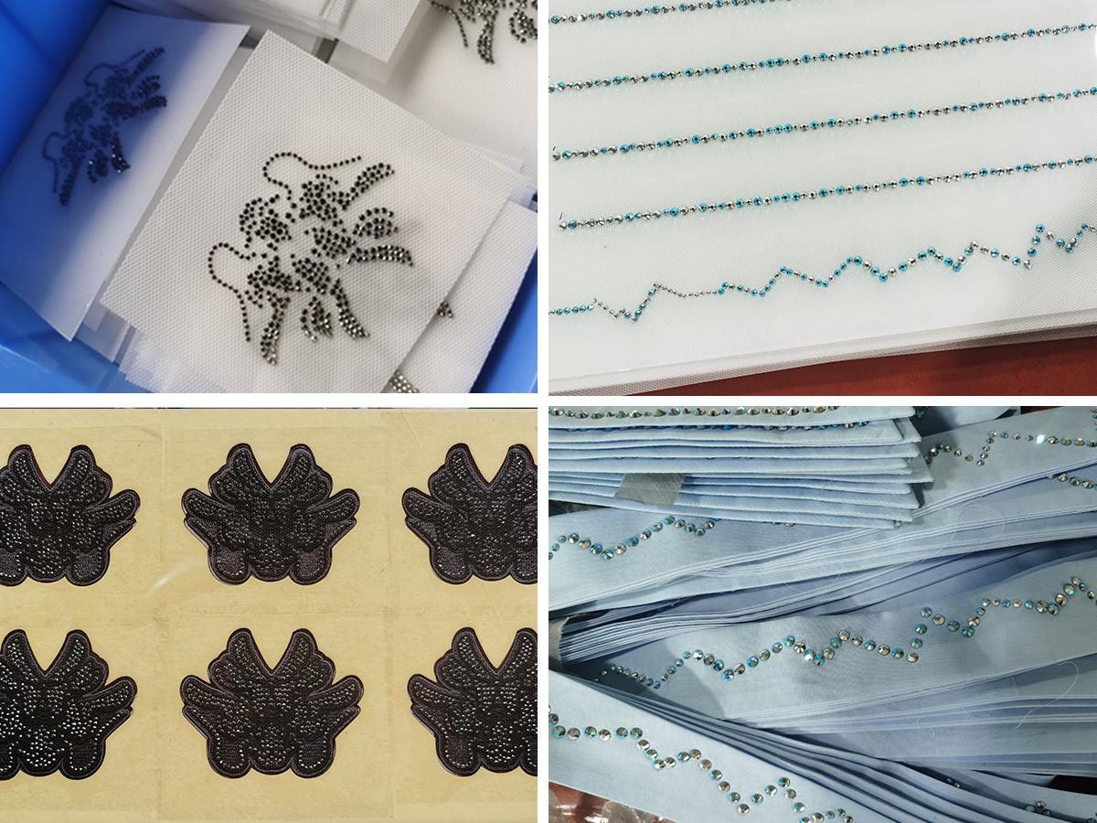 1. Hotfix Rhinestone Transfer: We craft rhinestone patterns from loose hotfix stones, based on clients' creative designs.