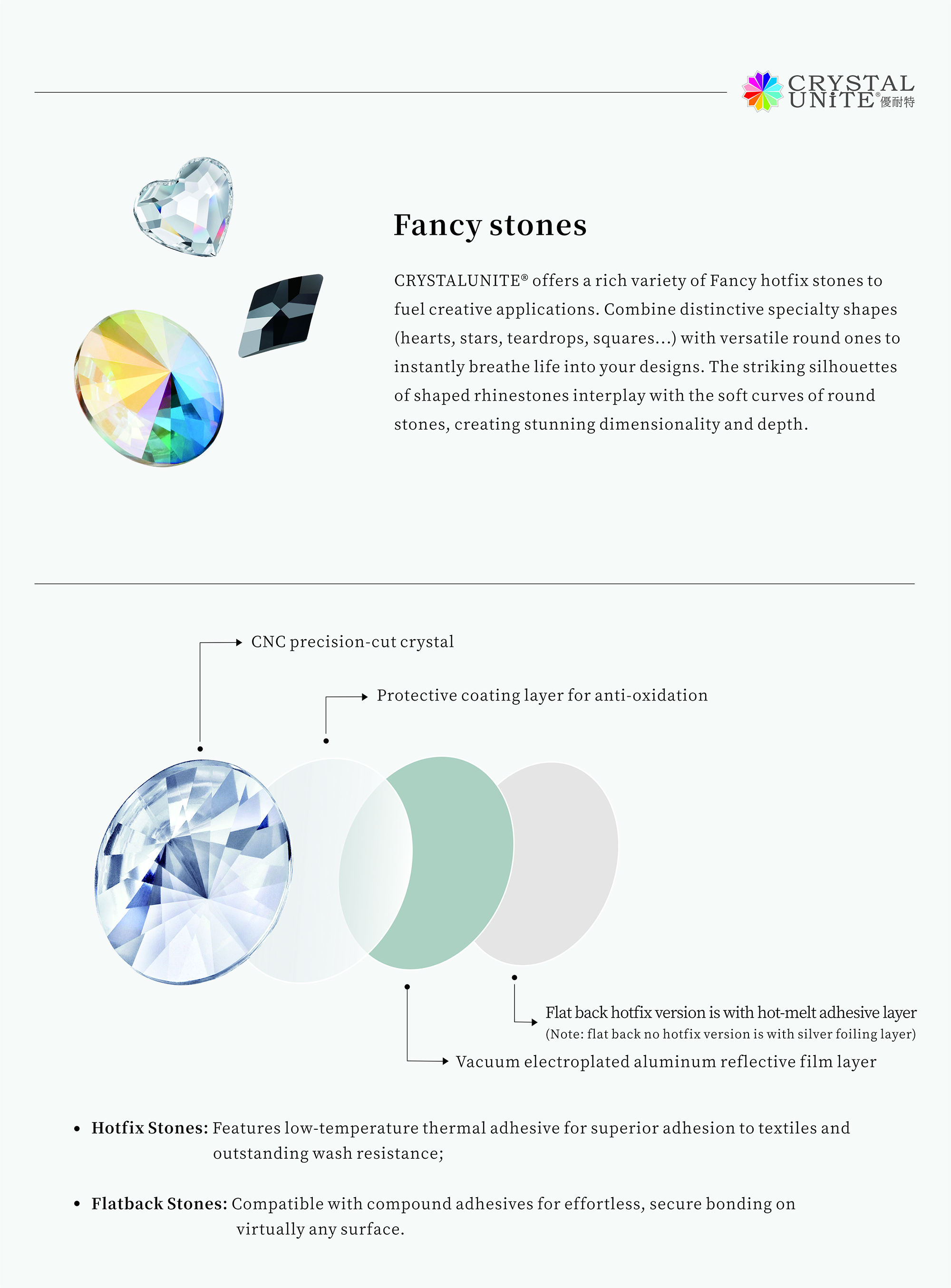 CRYSTALUNITE® offers a rich variety of Fancy hotfix stones to fuel creative applications. Combine distinctive specialty shapes (hearts, stars, teardrops, squares...) with versatile round ones to instantly breathe life into your designs. The striking silhouettes of shaped rhinestones interplay with the soft curves of round stones, creating stunning dimensionality and depth.