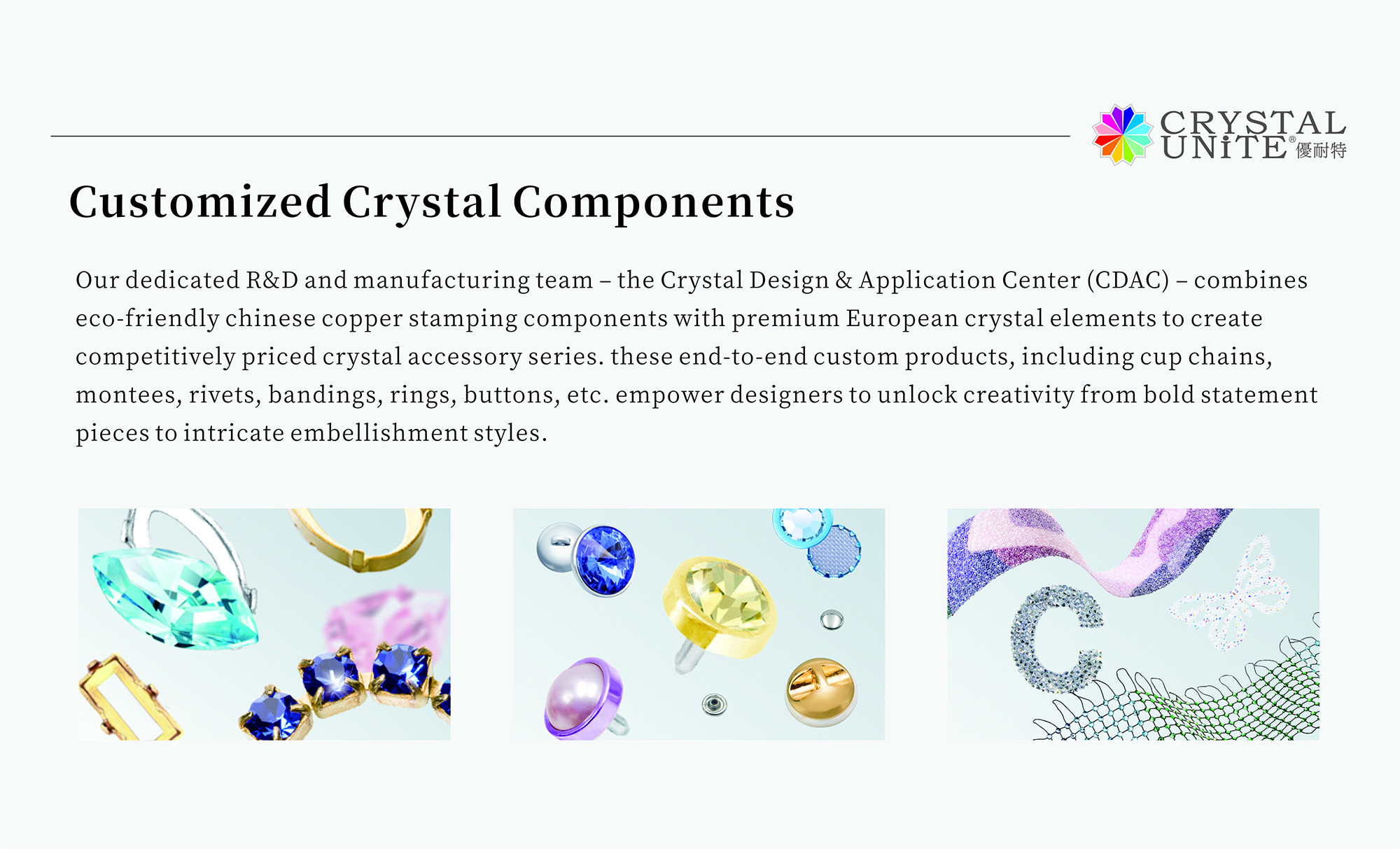 Crystal Design & Application Center (CDAC) is the dedicated R&D and manufacturing team exclusively configured by Harmony Fashion Jewelry Co., Ltd. for its brand CRYSTALUNITE®. CDAC specializes in providing comprehensive one-stop solutions for all crystal application needs.