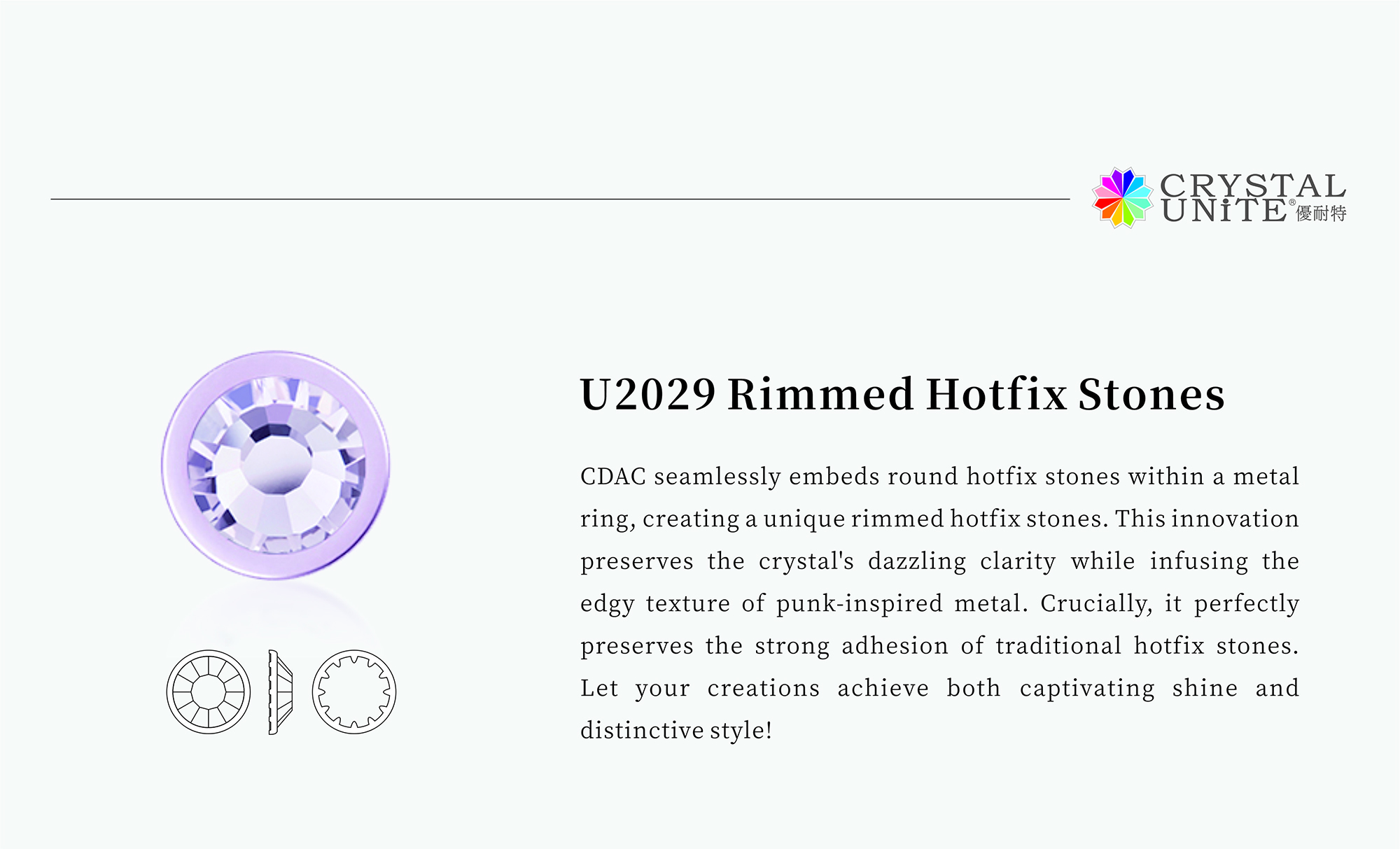 Brand Name Crystal Unite Article No. U2029 Origin Place China Size SS16-SS48 Type Rhinestones Style Flat back Shape Round Technics Hotfix / Heat Transfer Application Apparel & Accessories, Home Textiles, Nail Art, Jewelry,Handicrafts, Gifts, Toys, Consumer Electronics.etc