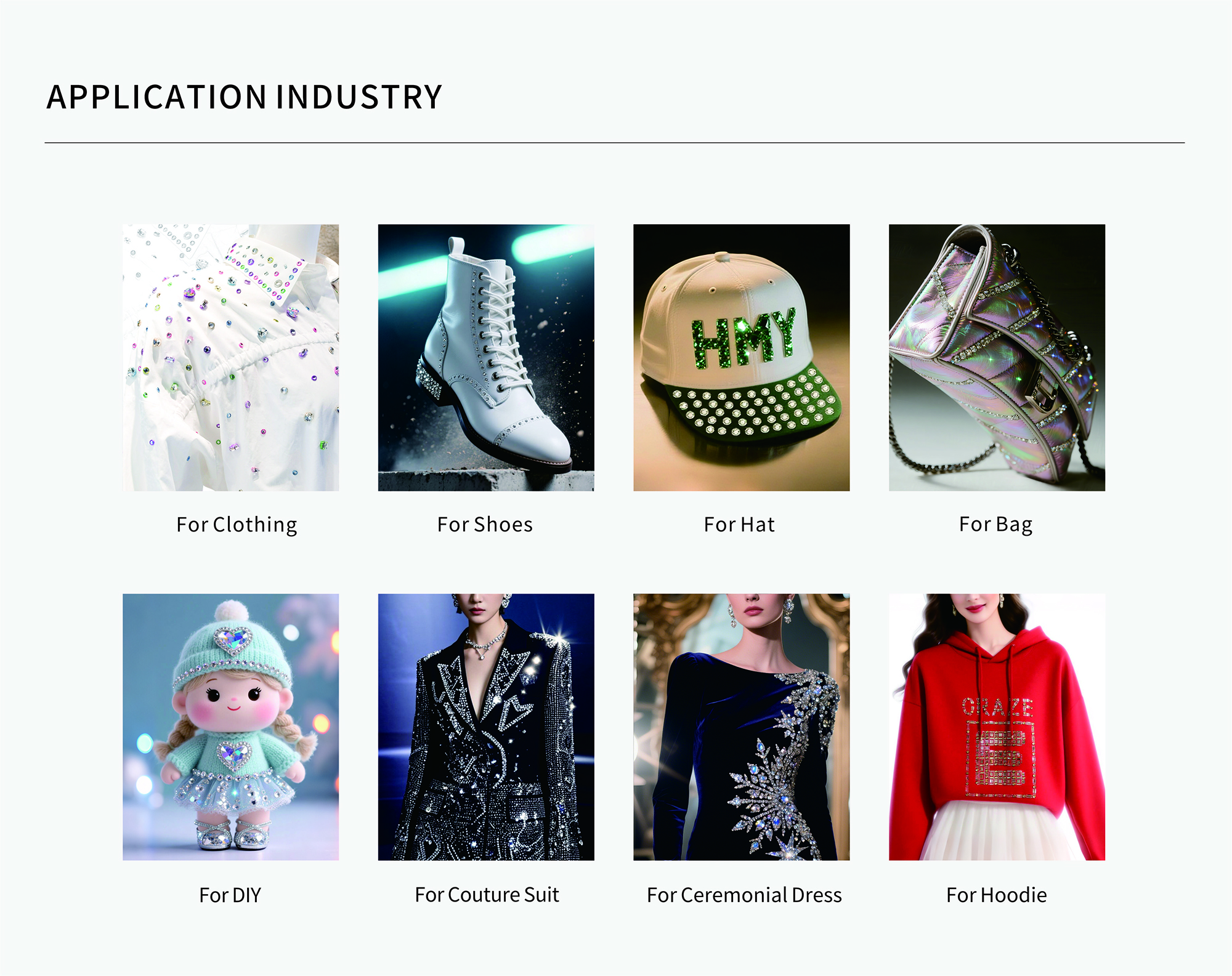 The process of assembling loose hotfix rhinestones into creative patterns and heat-transferring them onto fabrics may present technical hurdles. CDAC delivers end-to-end solutions spanning design, material allocation, prototyping to mass production. We have successfully served multiple international high-end fashion brands. -