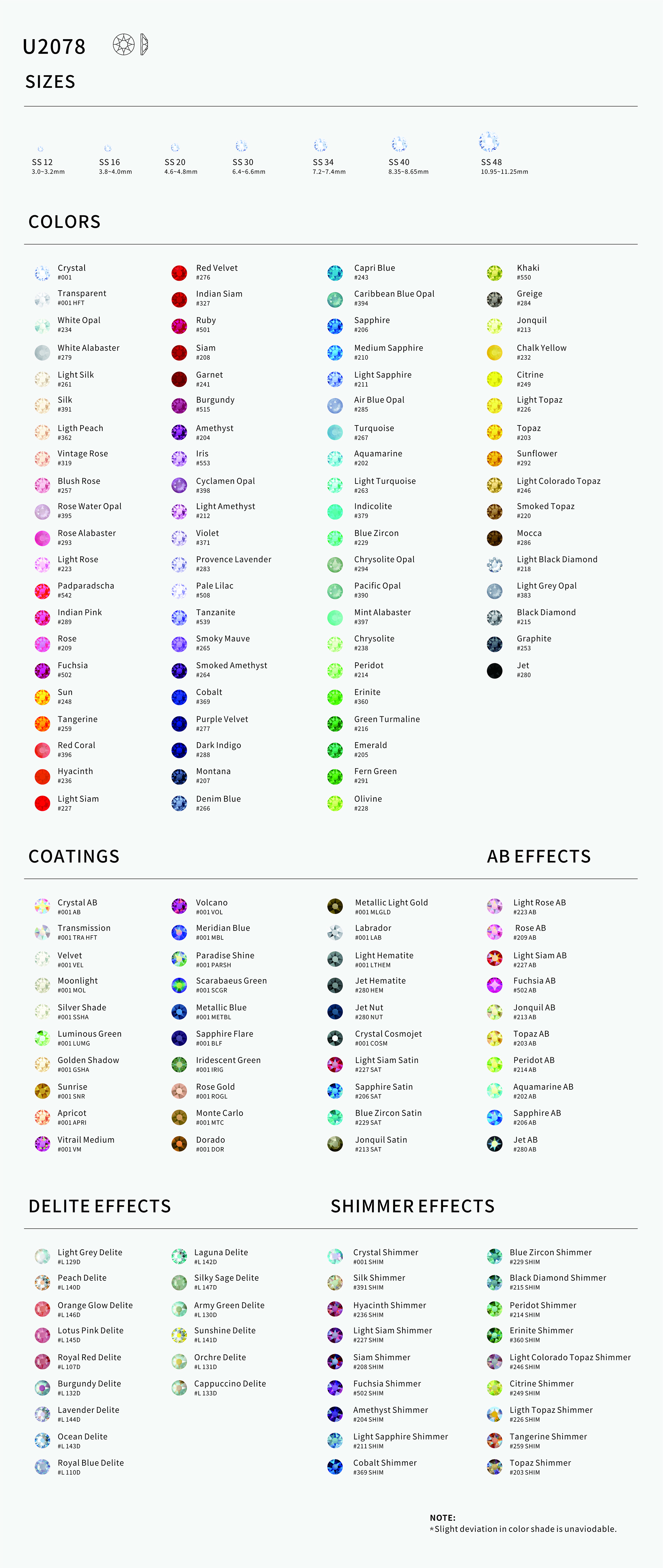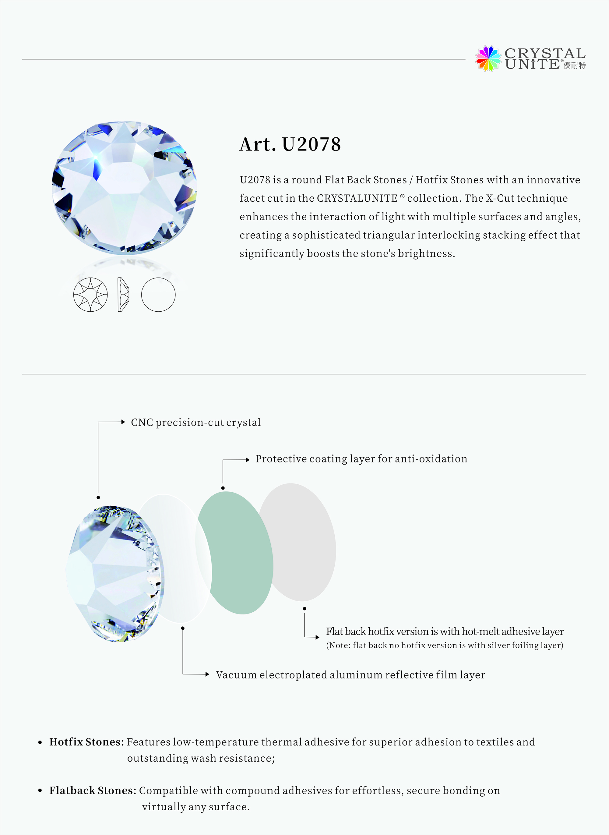Brand Name Crystal Unite Article No. U2078 Origin Place China Size SS12-SS48 Type Rhinestones Style Flat back Shape Round Technics Hotfix Stones Application Apparel & Accessories, Home Textiles, Nail Art, Jewelry,Handicrafts, Gifts, Toys, Consumer Electronics.etc