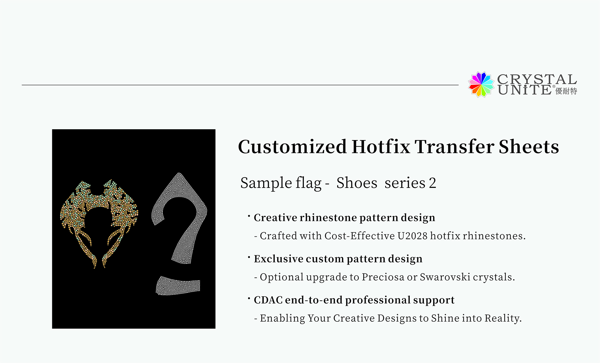 The process of assembling loose hotfix rhinestones into creative patterns and heat-transferring them onto fabrics may present technical hurdles. Our dedicated R&D and manufacturing team – the Crystal Design & Application Center (CDAC) delivers end-to-end solutions spanning design, material allocation, prototyping to mass production. We have successfully served multiple international high-end fashion brands.