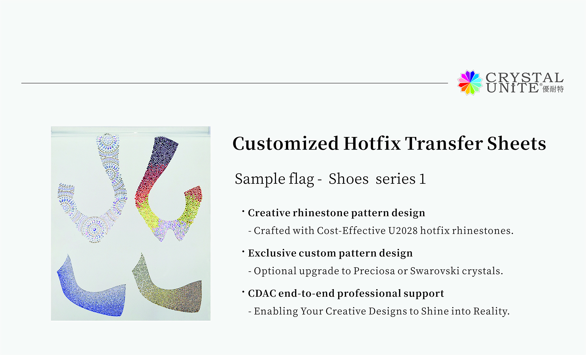 The process of assembling loose hotfix rhinestones into creative patterns and heat-transferring them onto fabrics may present technical hurdles. Our dedicated R&D and manufacturing team – the Crystal Design & Application Center (CDAC) delivers end-to-end solutions spanning design, material allocation, prototyping to mass production. We have successfully served multiple international high-end fashion brands.
