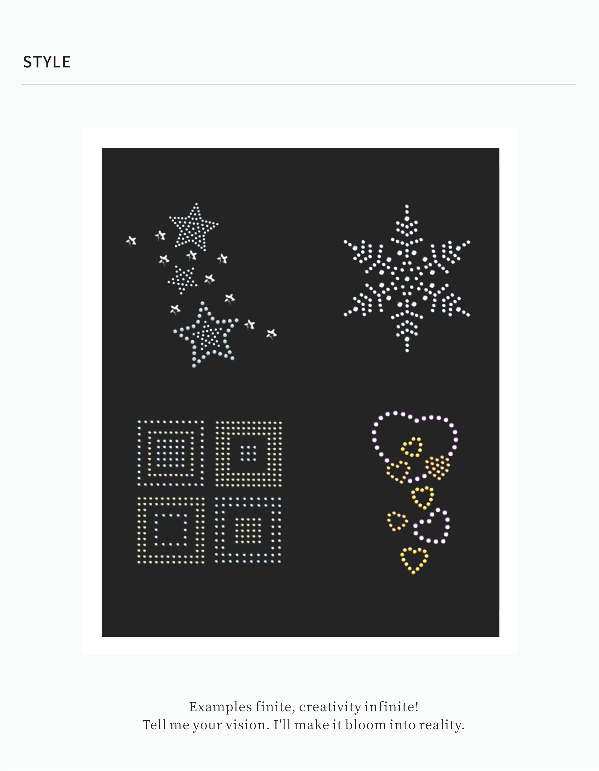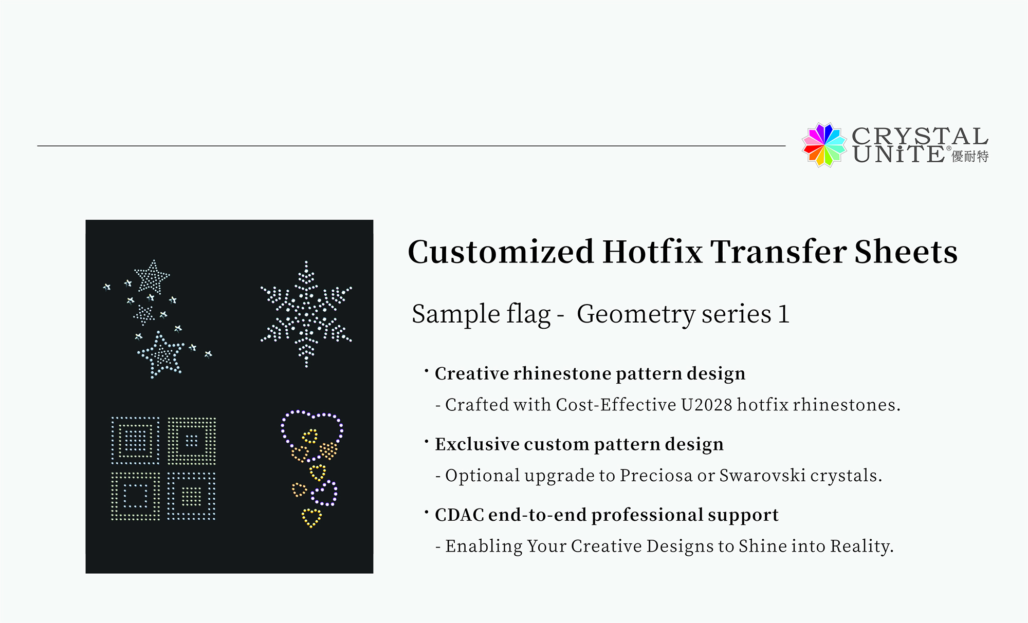 The process of assembling loose hotfix rhinestones into creative patterns and heat-transferring them onto fabrics may present technical hurdles. Our dedicated R&D and manufacturing team – the Crystal Design & Application Center (CDAC) delivers end-to-end solutions spanning design, material allocation, prototyping to mass production. We have successfully served multiple international high-end fashion brands.