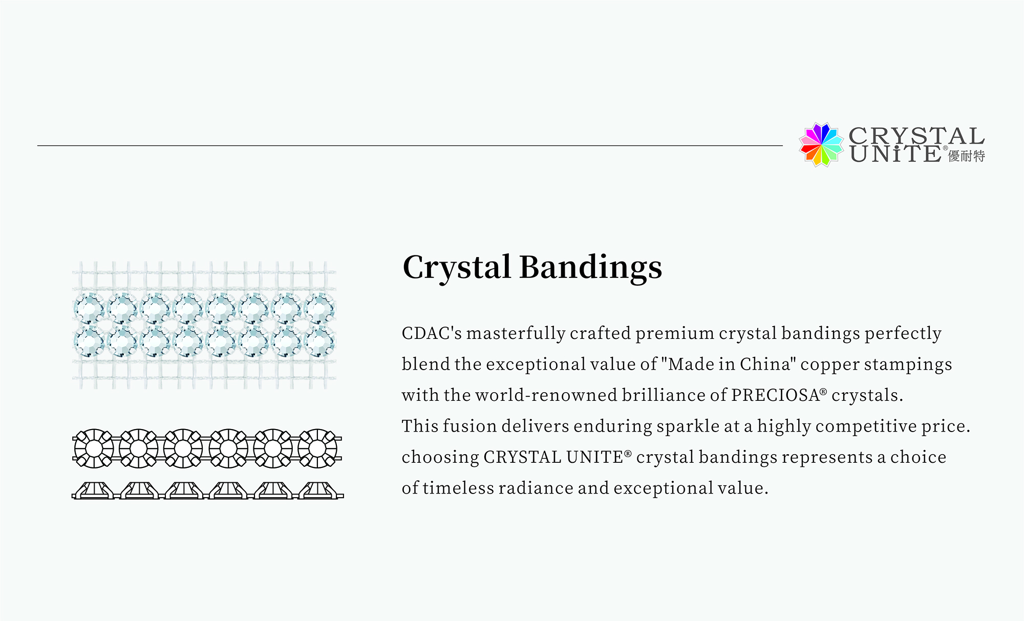 CDAC's masterfully crafted premium crystal bandings perfectly blend the exceptional value of "Made in China" copper stampings with the world-renowned brilliance of Preciosa® crystals. This fusion delivers enduring sparkle at a highly competitive price. Choosing Crystalunite® crystal bandings represents a choice of timeless radiance and exceptional value.