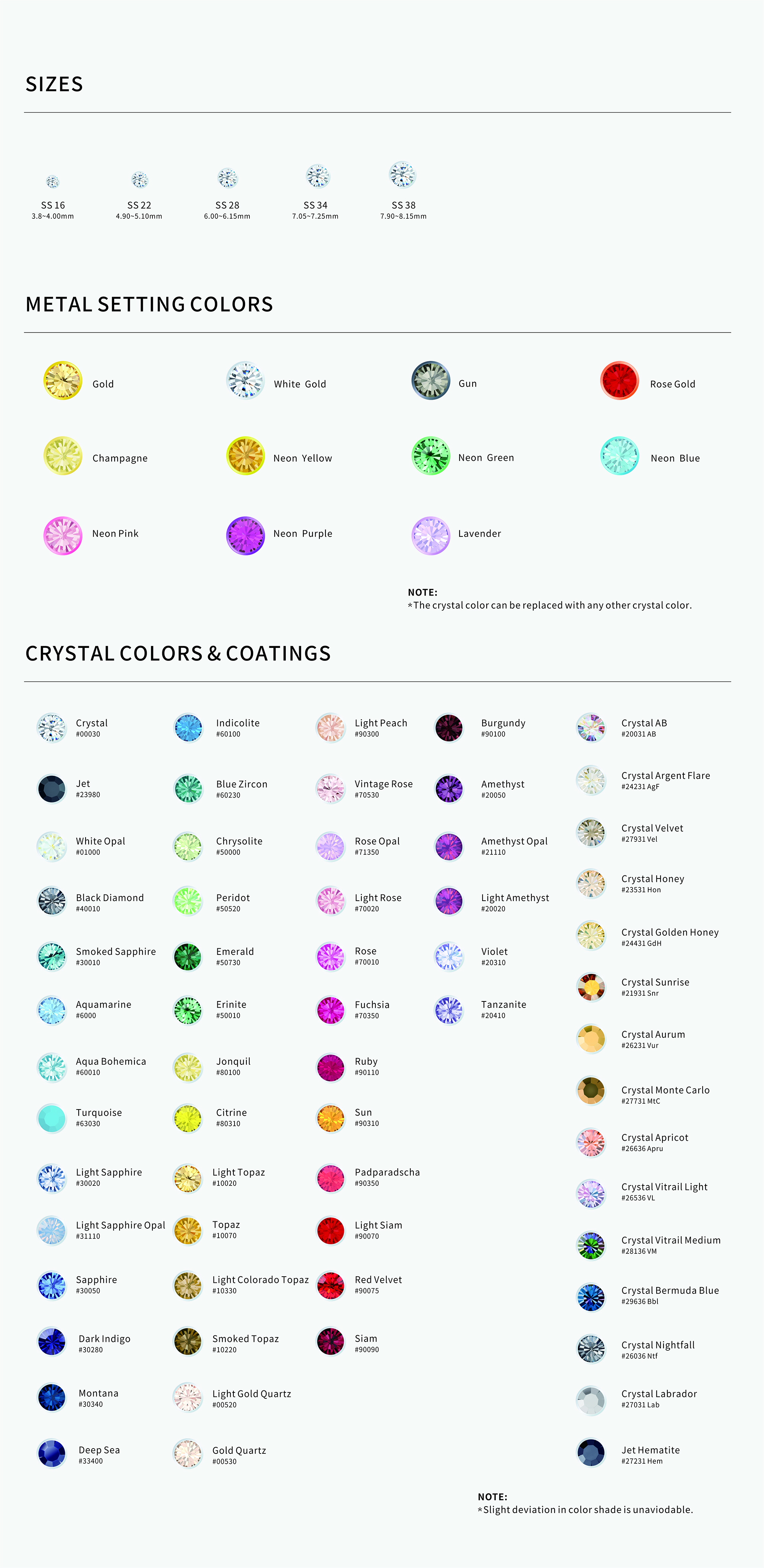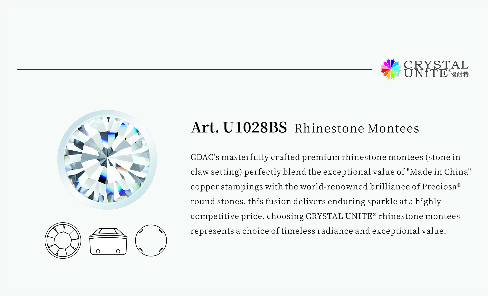 Brand Name Crystal Unite Article No. U1028BS Origin Place China Size SS16-SS38 Type Sew-on Montees Style Point back Shape Round Technics Hand Sewing,