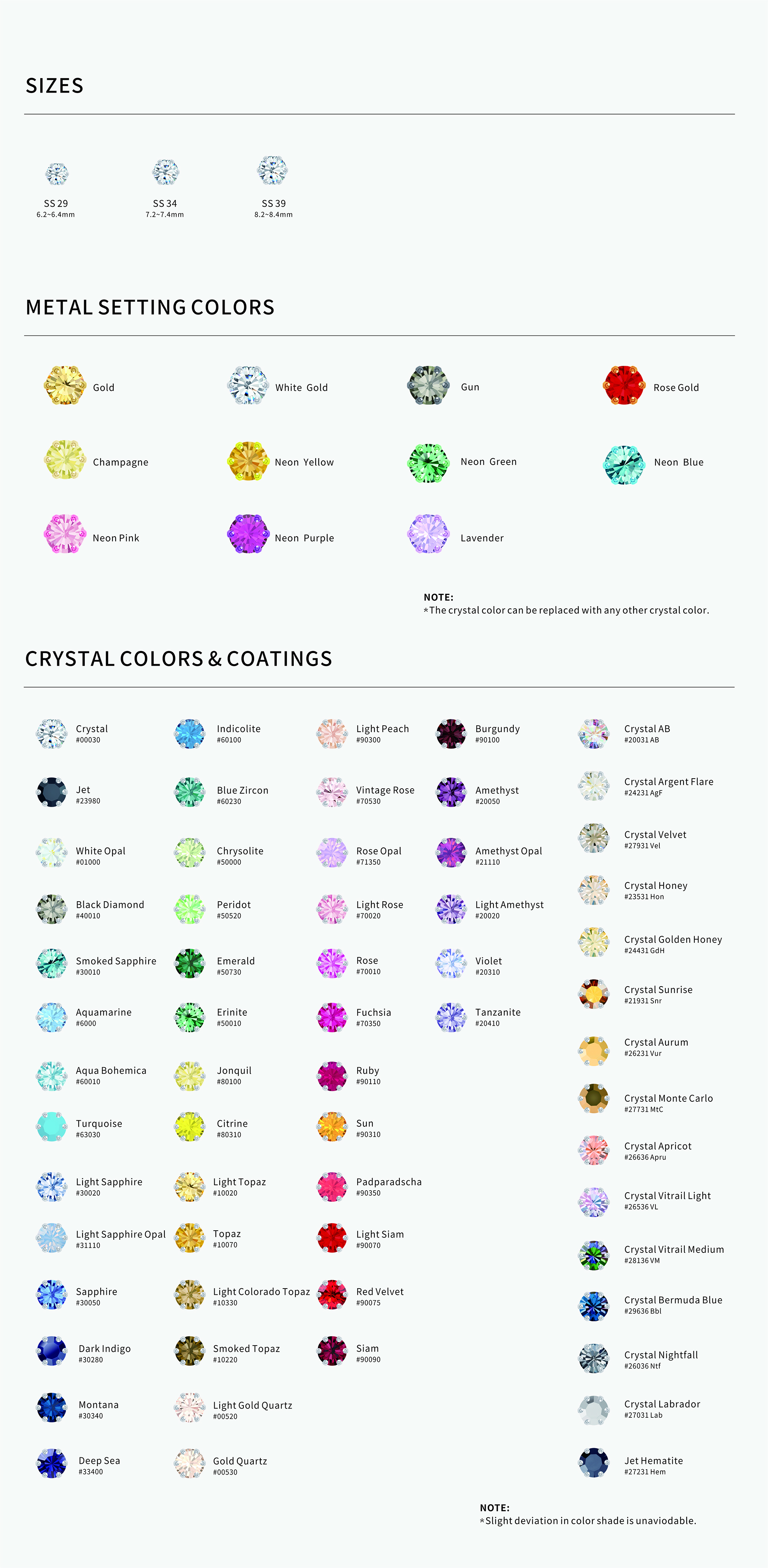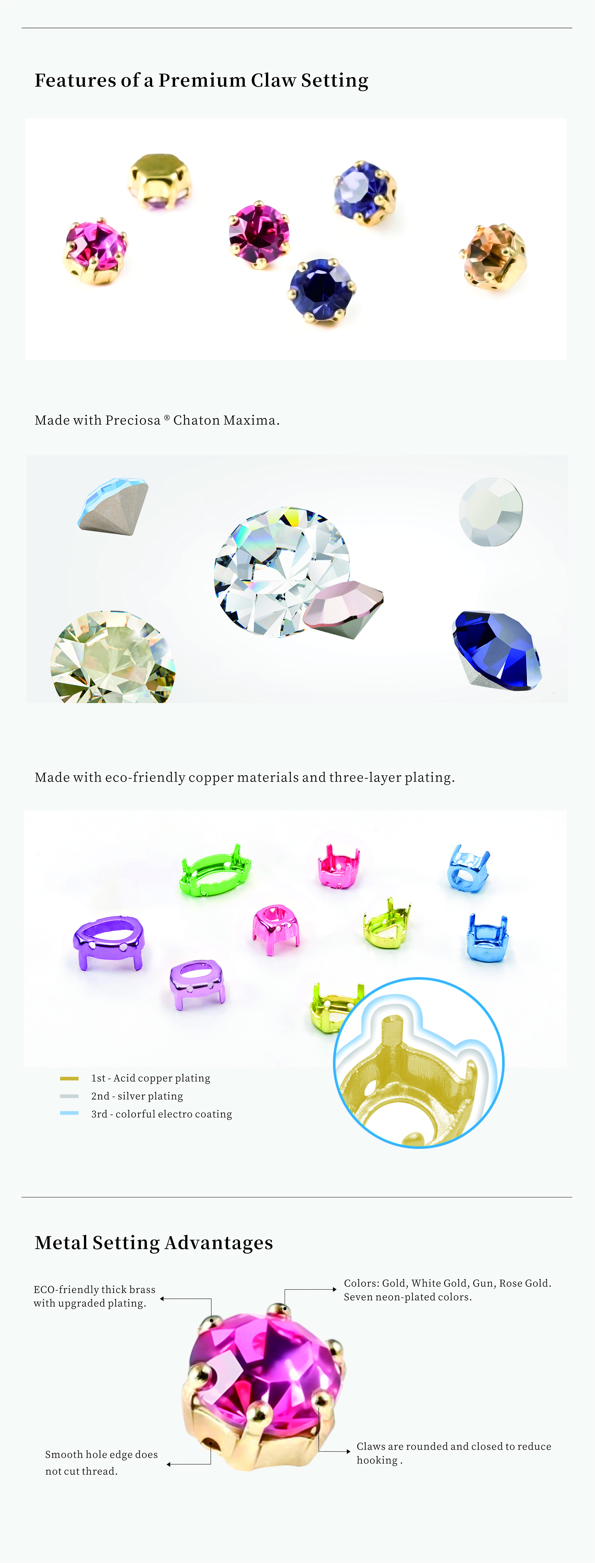 CDAC combines eco-friendly Chinese copper stamping components with premium European crystal elements to create competitively priced crystal accessory series. These end-to-end custom products, including Cup Chains, Montees, Rivets, Bandings, Rings, Buttons, etc. empower designers to unlock creativity from bold statement pieces to intricate embellishment styles. -
