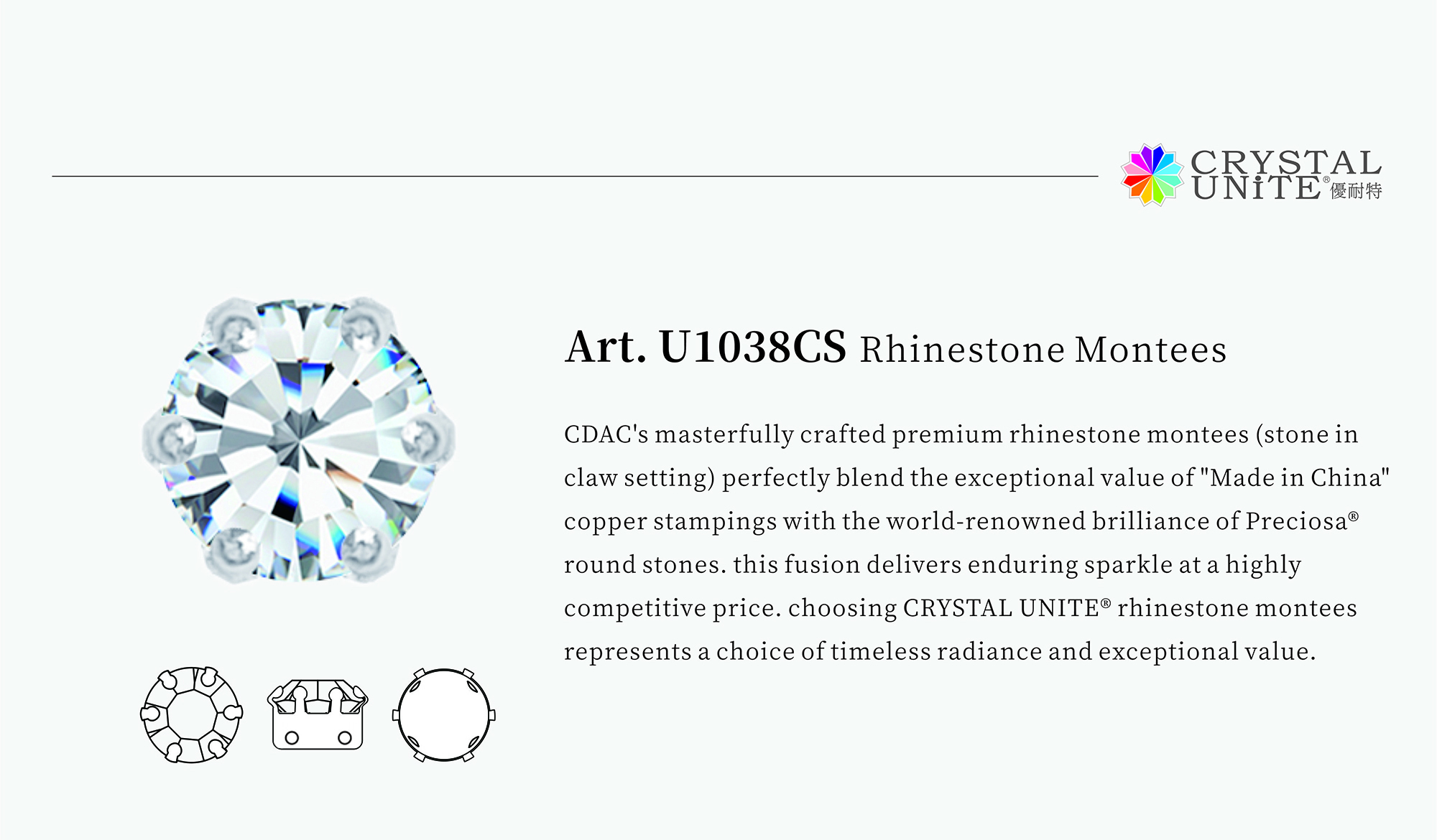 Brand Name Crystal Unite Article No. U1038CS Origin Place China Size SS16-SS38 Type Sew-on Montees Style Point back Shape Round Technics Hand Sewing,