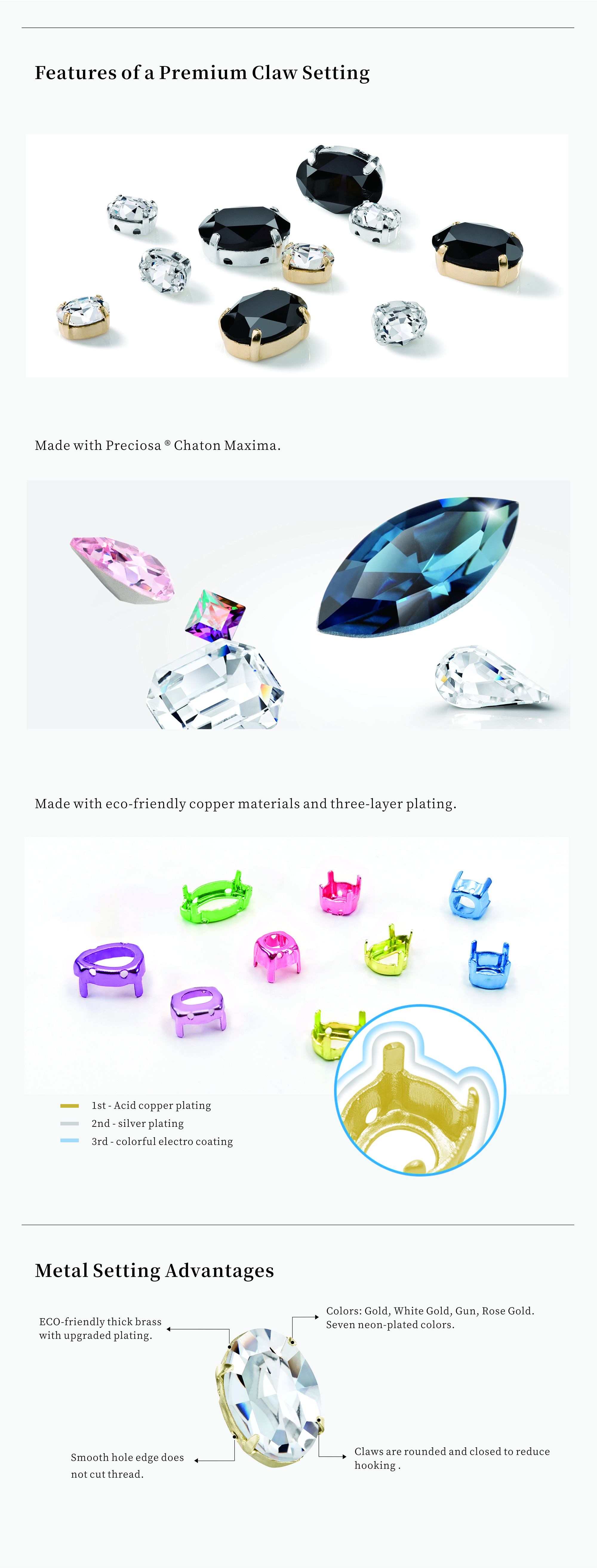 CDAC combines eco-friendly Chinese copper stamping components with premium European crystal elements to create competitively priced crystal accessory series. These end-to-end custom products, including Cup Chains, Montees, Rivets, Bandings, Rings, Buttons, etc. empower designers to unlock creativity from bold statement pieces to intricate embellishment styles. -