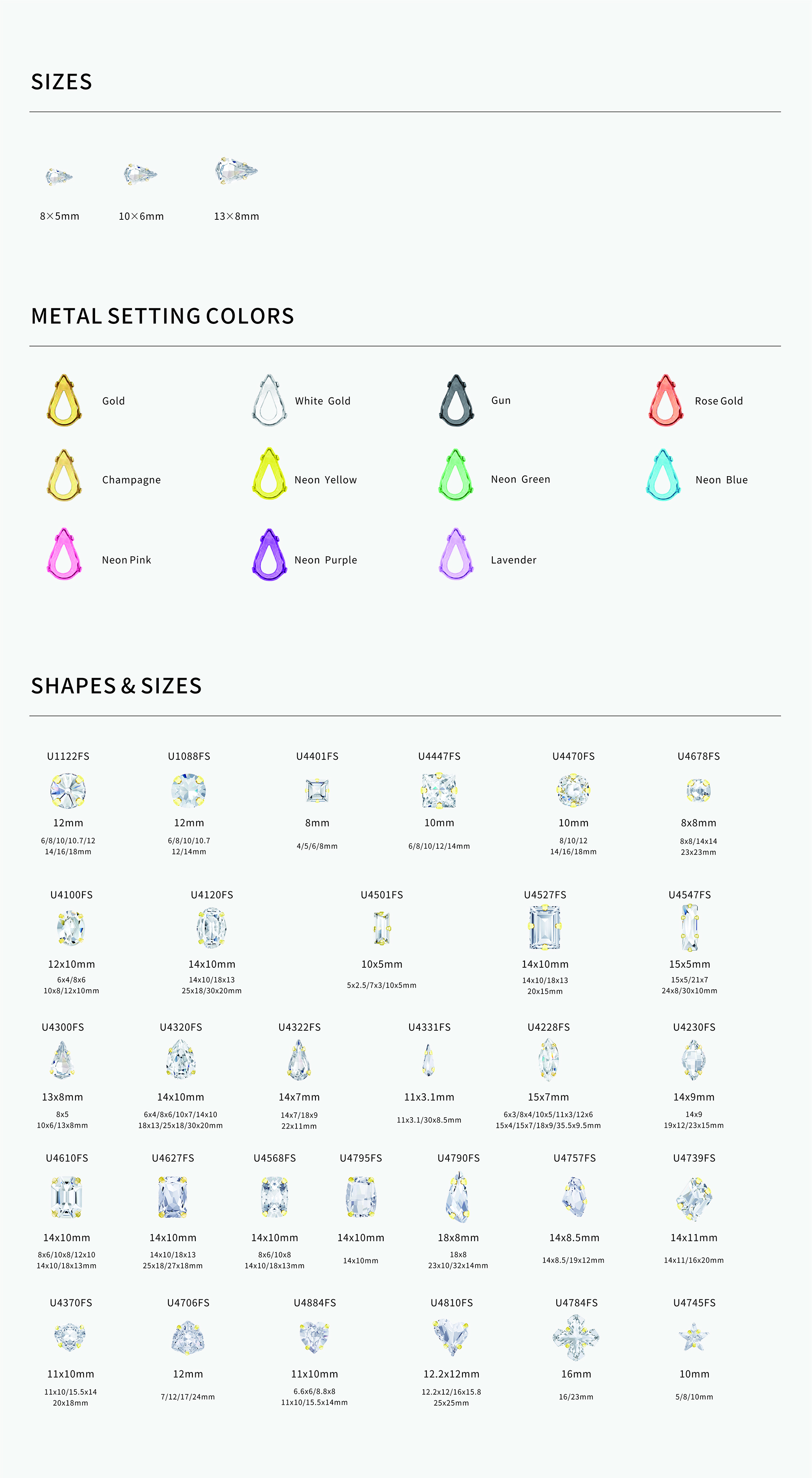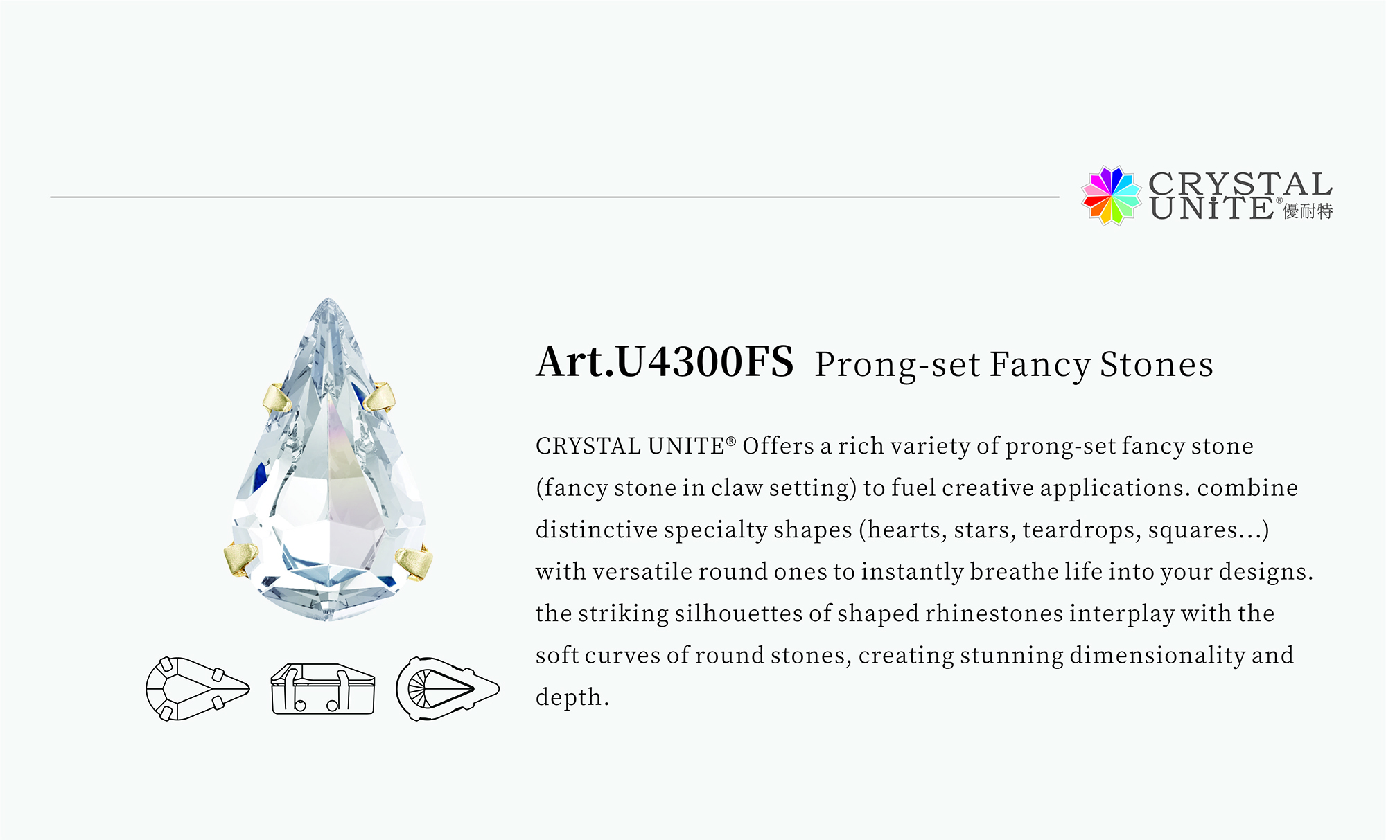 Brand Name Crystal Unite Article No. U4300FS Origin Place China Size 3 sizes in total Type Sew-on Montees Style Point back Shape Pear Technics Hand Sewing,