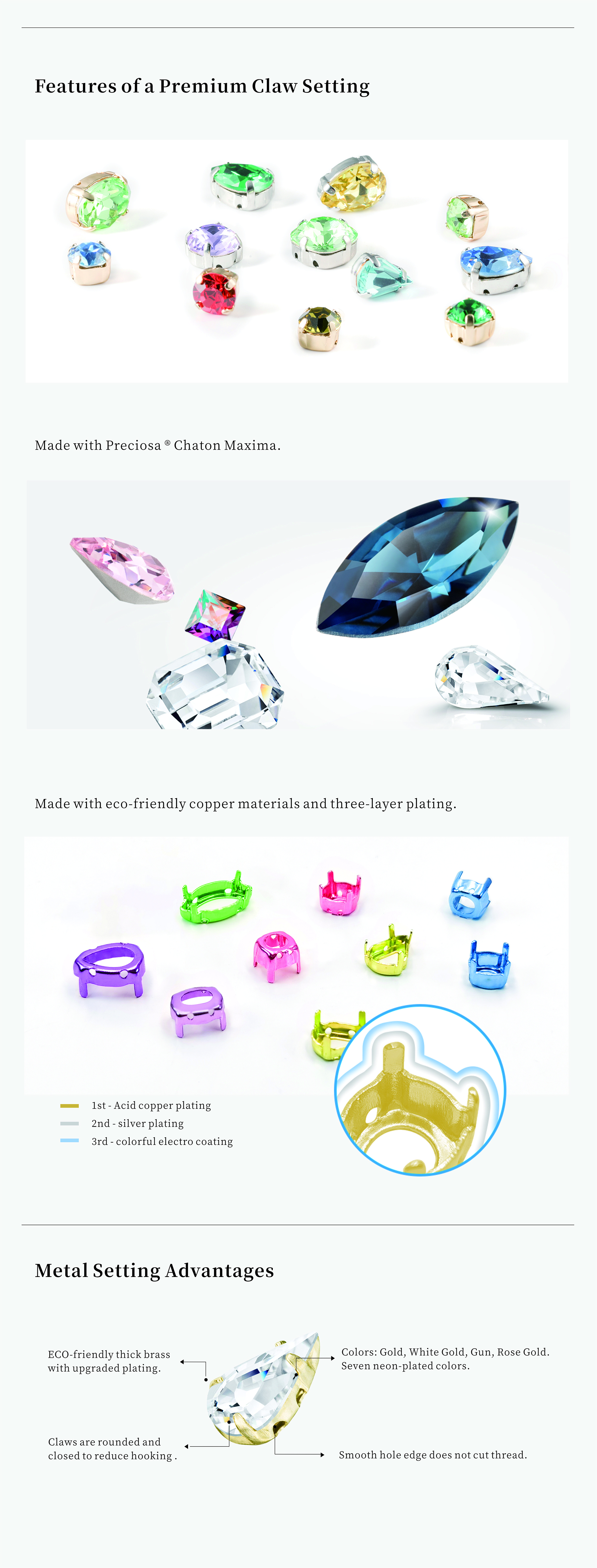 CDAC combines eco-friendly Chinese copper stamping components with premium European crystal elements to create competitively priced crystal accessory series. These end-to-end custom products, including Cup Chains, Montees, Rivets, Bandings, Rings, Buttons, etc. empower designers to unlock creativity from bold statement pieces to intricate embellishment styles. -