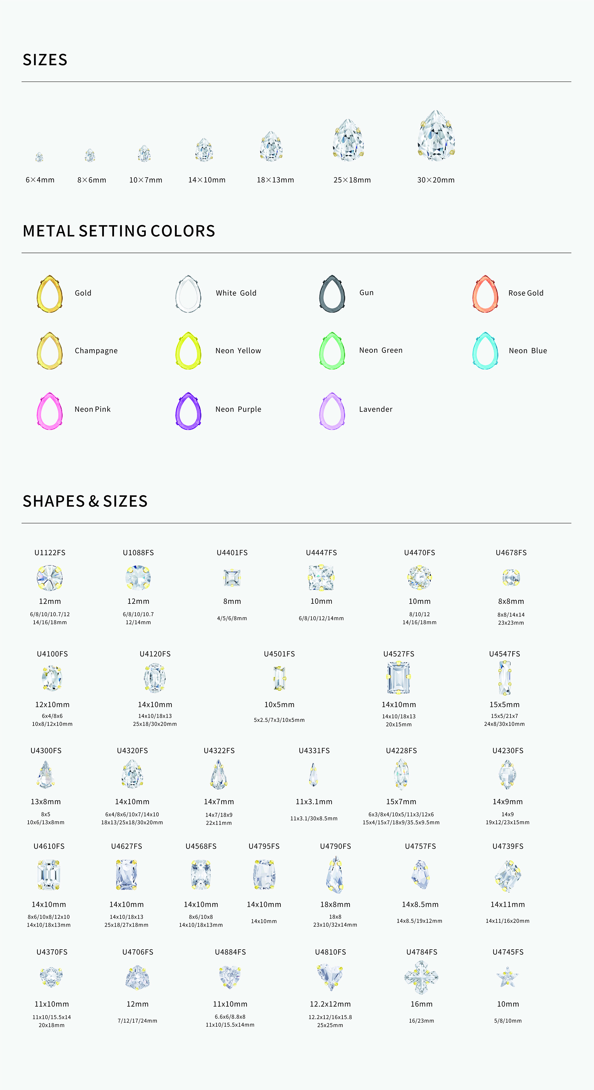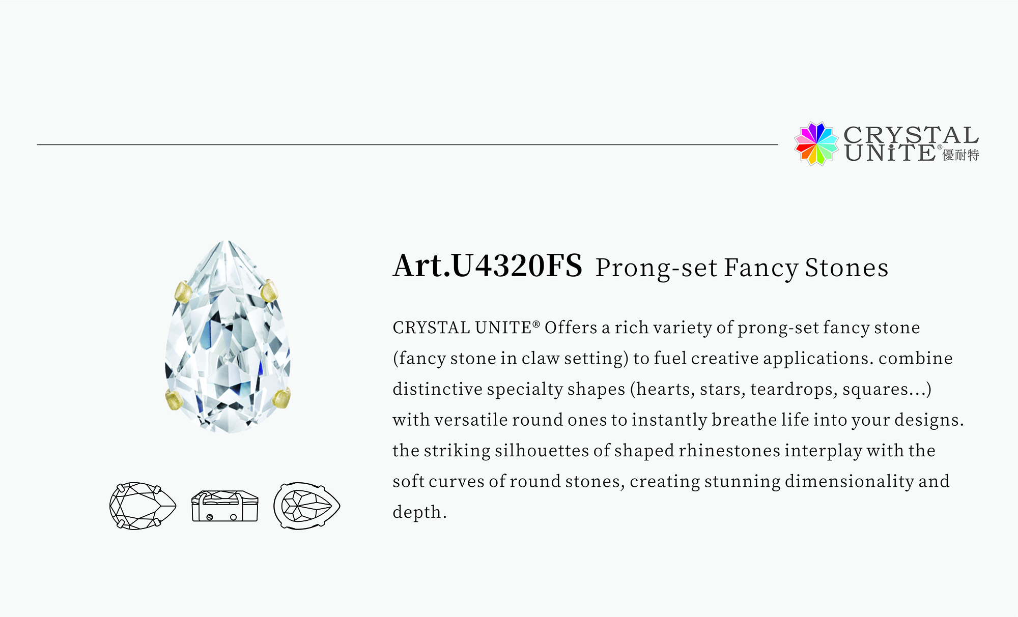 Brand Name Crystal Unite Article No. U4320FS Origin Place China Size 7 sizes in total Type Sew-on Montees Style Point back Shape Drop Technics Hand Sewing,