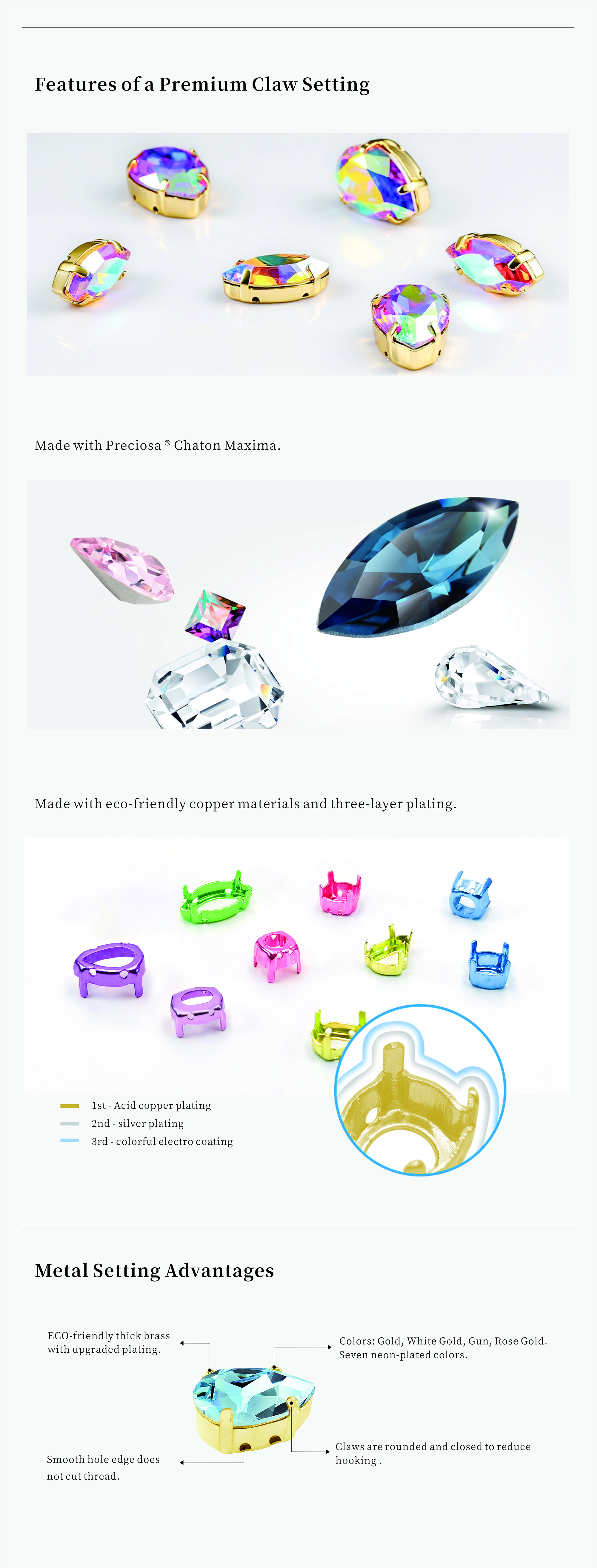 CDAC combines eco-friendly Chinese copper stamping components with premium European crystal elements to create competitively priced crystal accessory series. These end-to-end custom products, including Cup Chains, Montees, Rivets, Bandings, Rings, Buttons, etc. empower designers to unlock creativity from bold statement pieces to intricate embellishment styles. -
