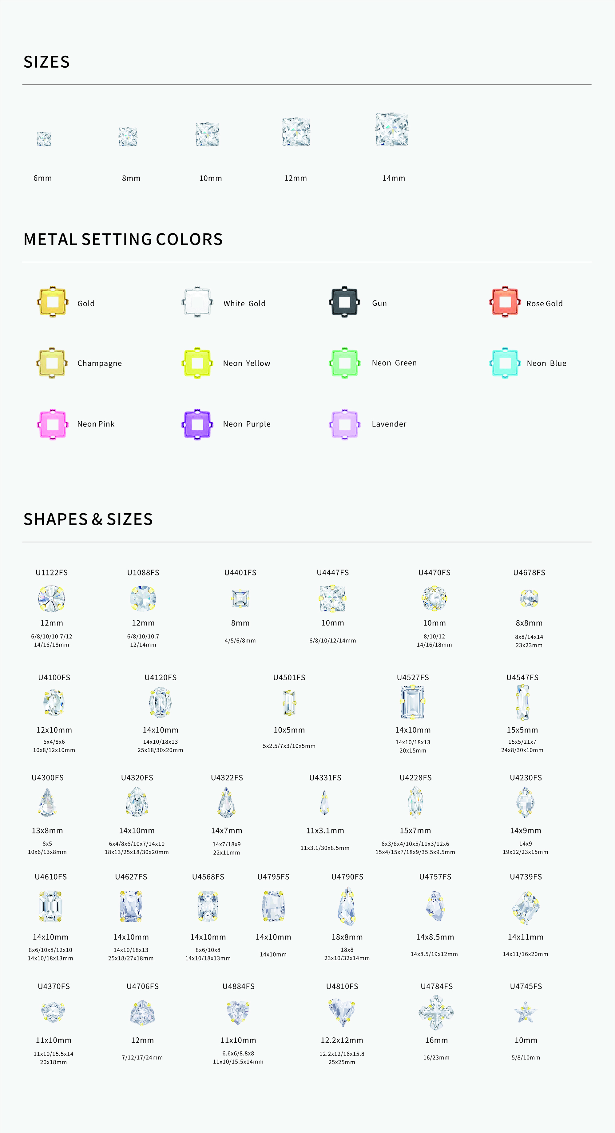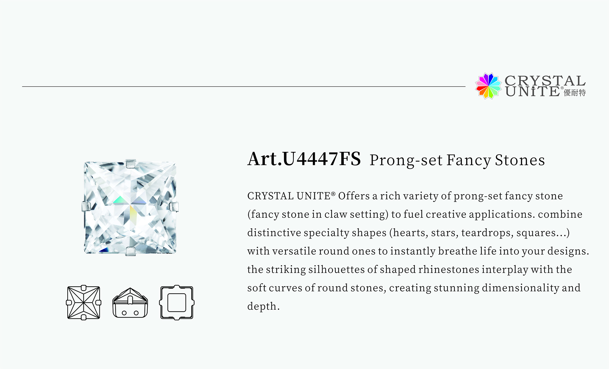 Brand Name Crystal Unite Article No. U4447FS Origin Place China Size 5 sizes in total Type Sew-on Montees Style Point back Shape Princess Square Technics Hand Sewing,