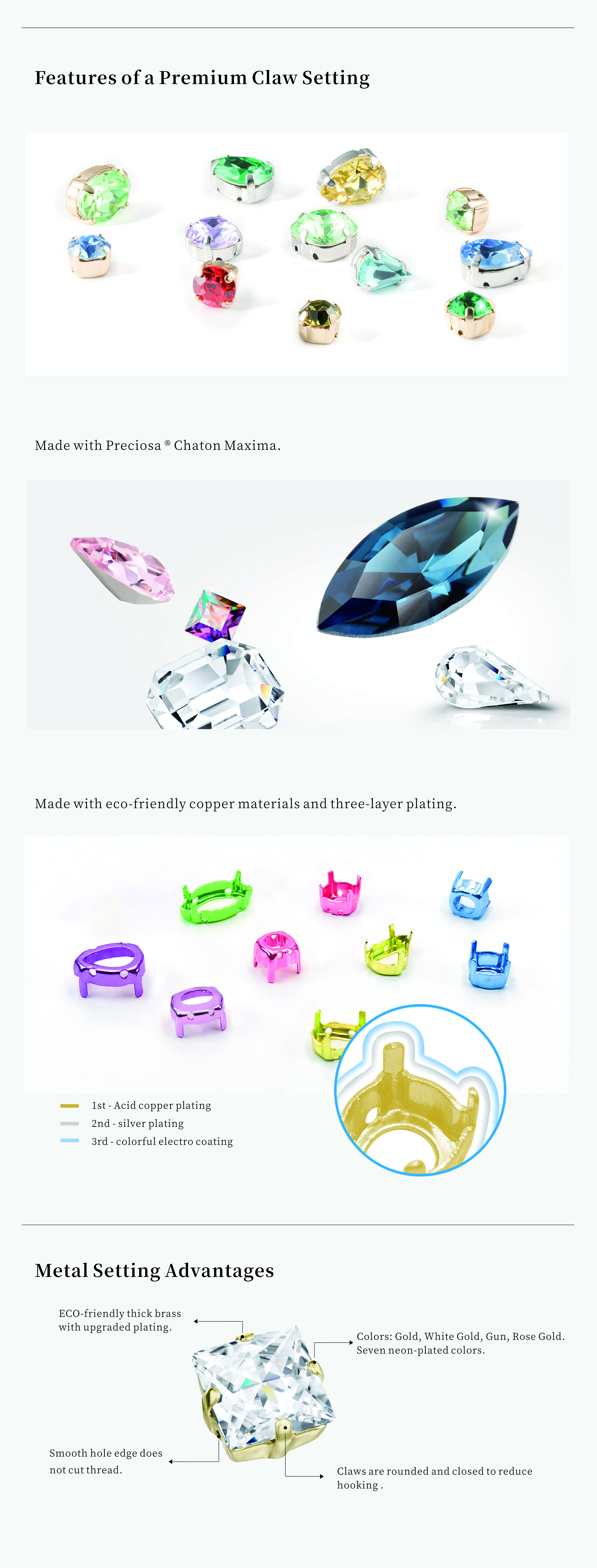 CDAC combines eco-friendly Chinese copper stamping components with premium European crystal elements to create competitively priced crystal accessory series. These end-to-end custom products, including Cup Chains, Montees, Rivets, Bandings, Rings, Buttons, etc. empower designers to unlock creativity from bold statement pieces to intricate embellishment styles. -