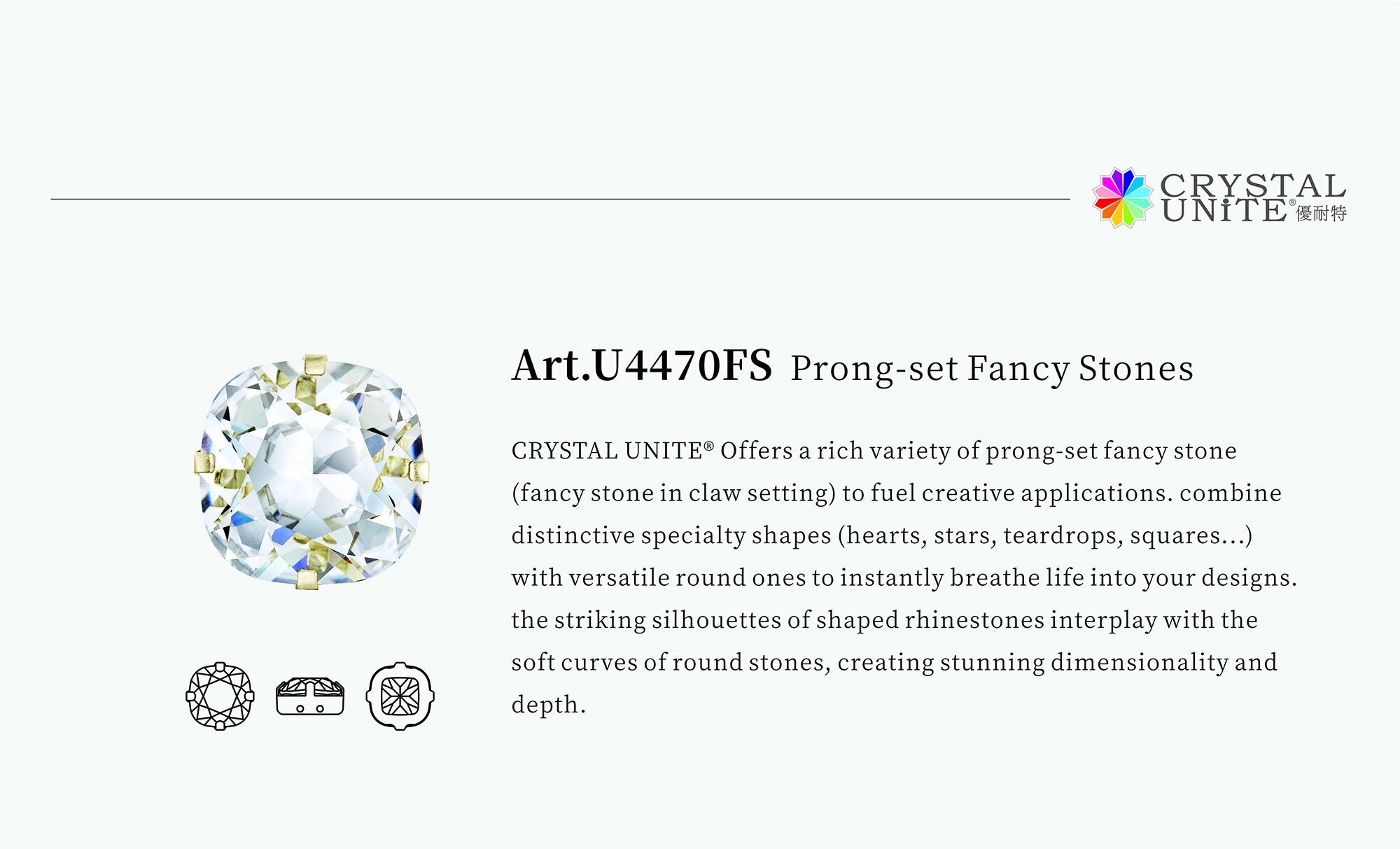 Crystalunite® offers a rich variety of prong-set fancy stone (fancy stone in claw setting) to fuel creative applications. Combine distinctive specialty shapes (hearts, stars, teardrops, squares...) with versatile round ones to instantly breathe life into your designs. The striking silhouettes of shaped rhinestones interplay with the soft curves of round stones, creating stunning dimensionality and depth.