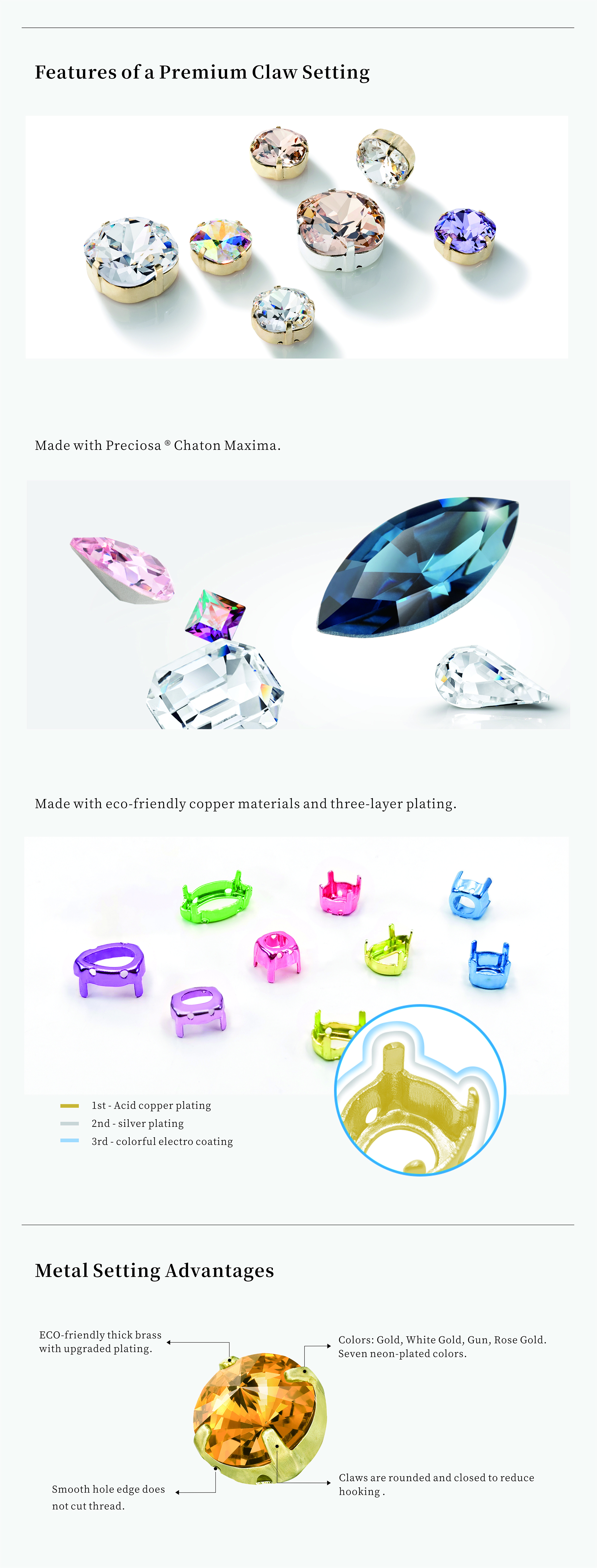 CDAC combines eco-friendly Chinese copper stamping components with premium European crystal elements to create competitively priced crystal accessory series. These end-to-end custom products, including Cup Chains, Montees, Rivets, Bandings, Rings, Buttons, etc. empower designers to unlock creativity from bold statement pieces to intricate embellishment styles.