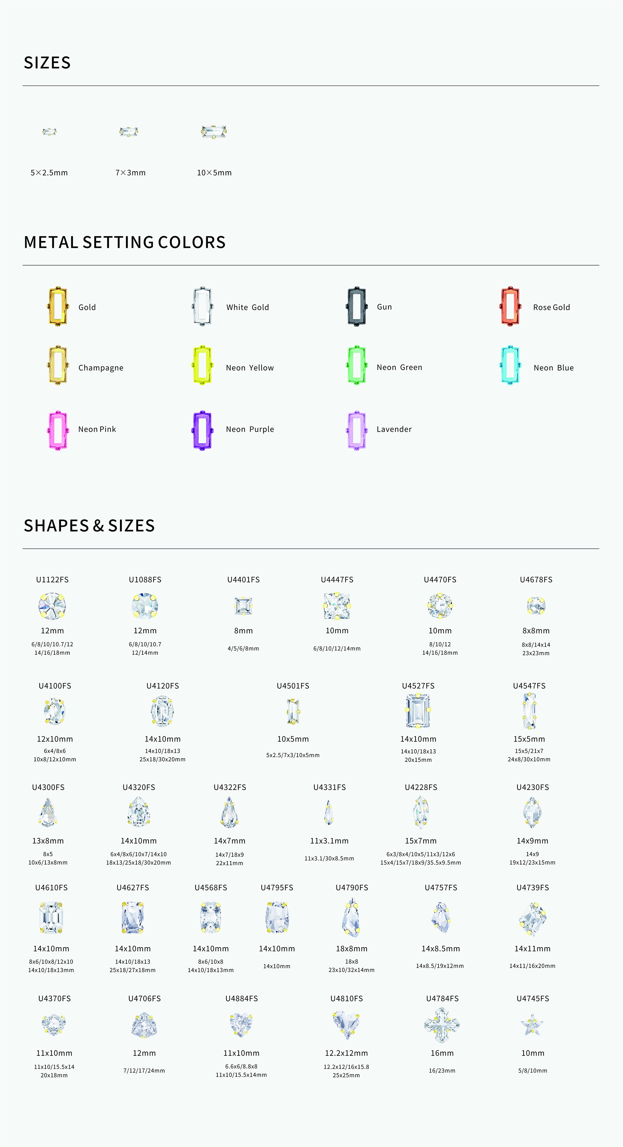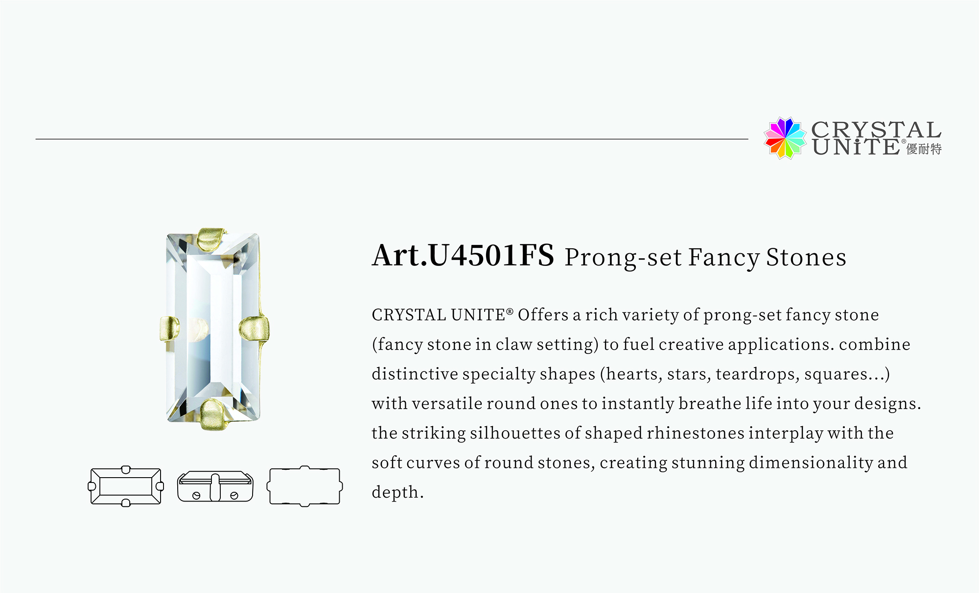 Brand Name Crystal Unite Article No. U4501FS Origin Place China Size 3 sizes in total Type Sew-on Montees Style Point back Shape Rectangle Technics Hand Sewing,