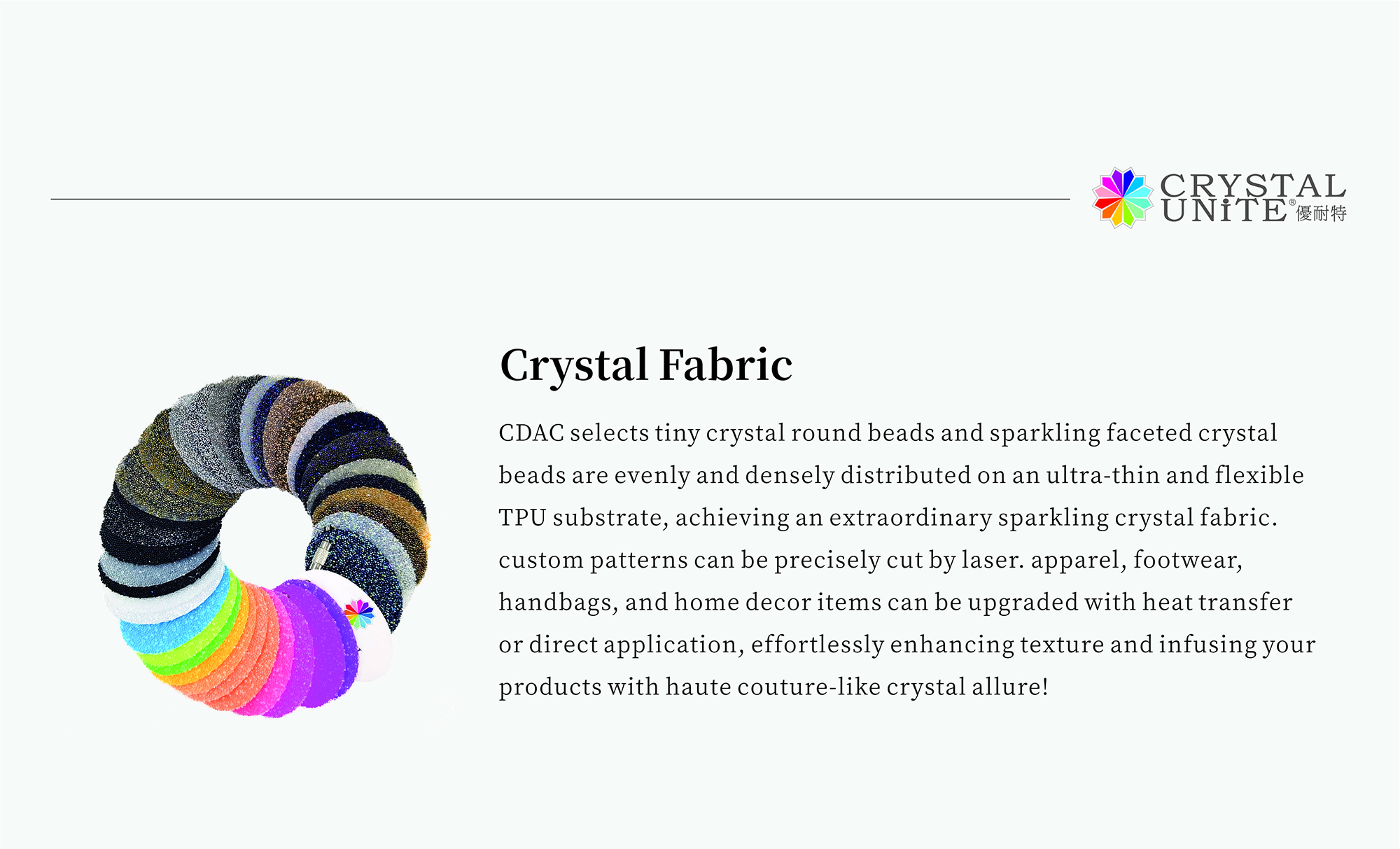 Crystal Design & Application Center (CDAC) is the dedicated R&D and manufacturing team exclusively configured by Harmony Fashion Jewelry Co., Ltd. for its brand CRYSTALUNITE®. CDAC specializes in providing comprehensive one-stop solutions for all crystal application needs