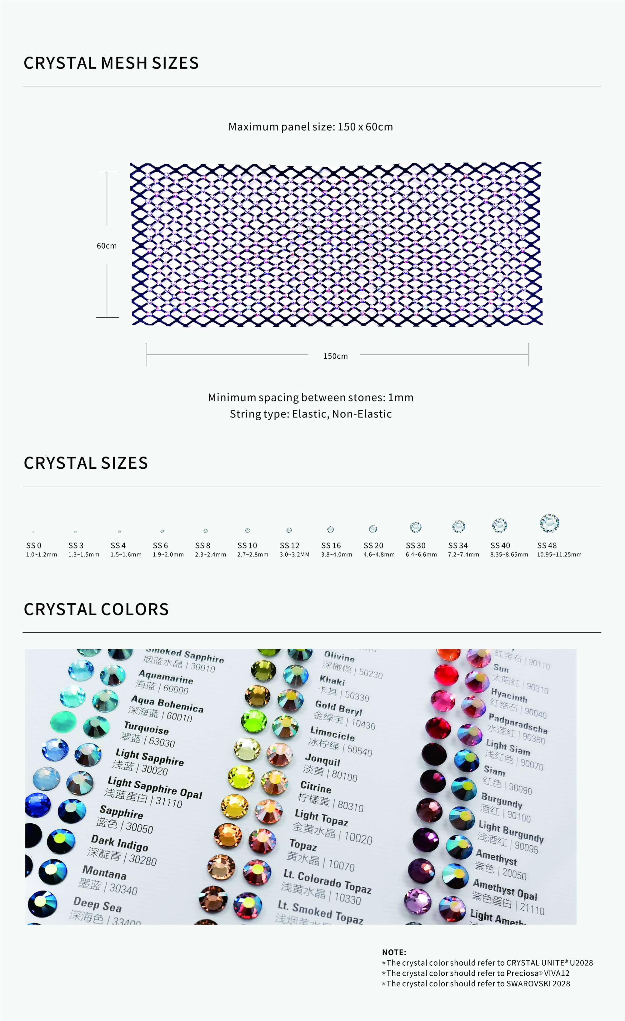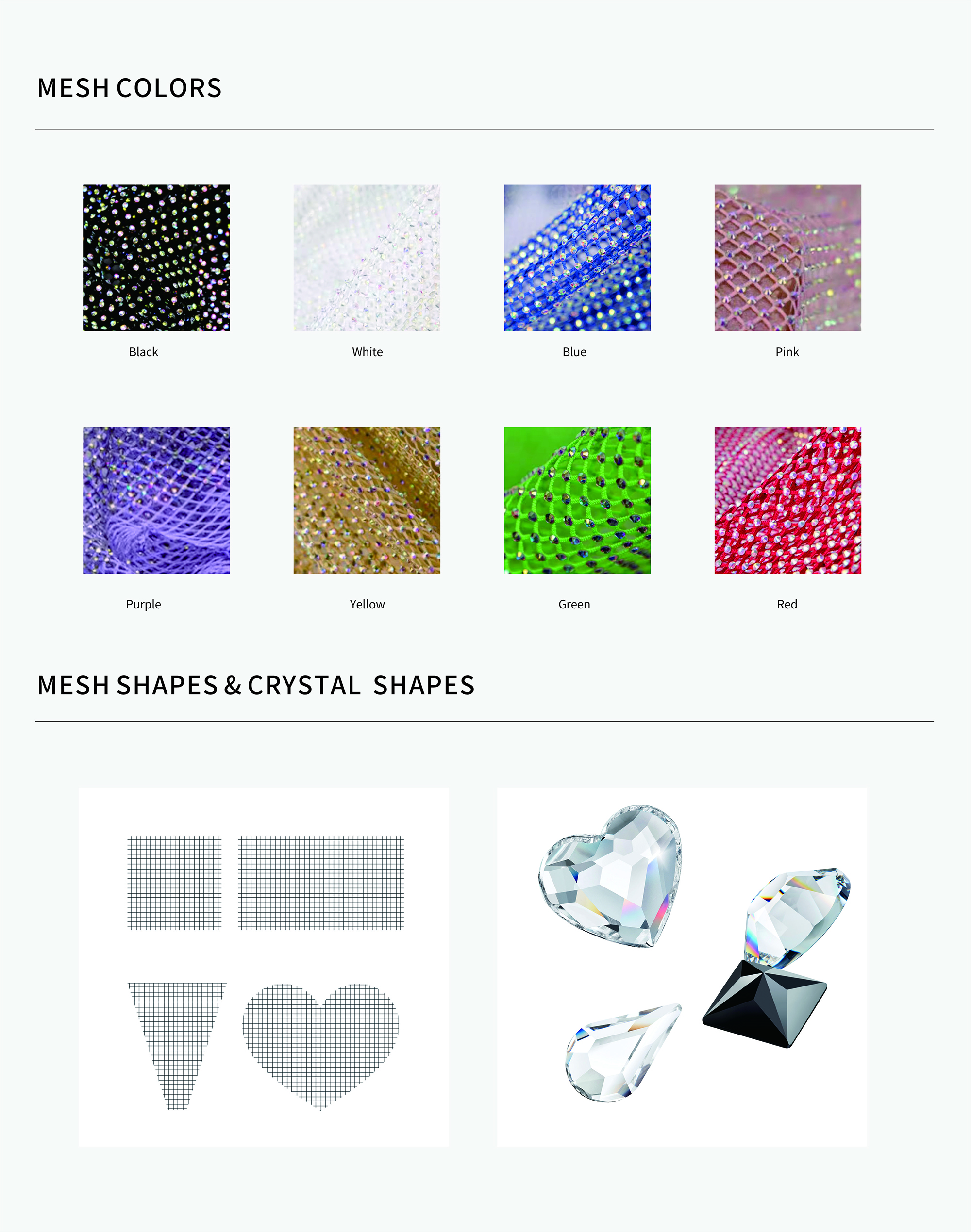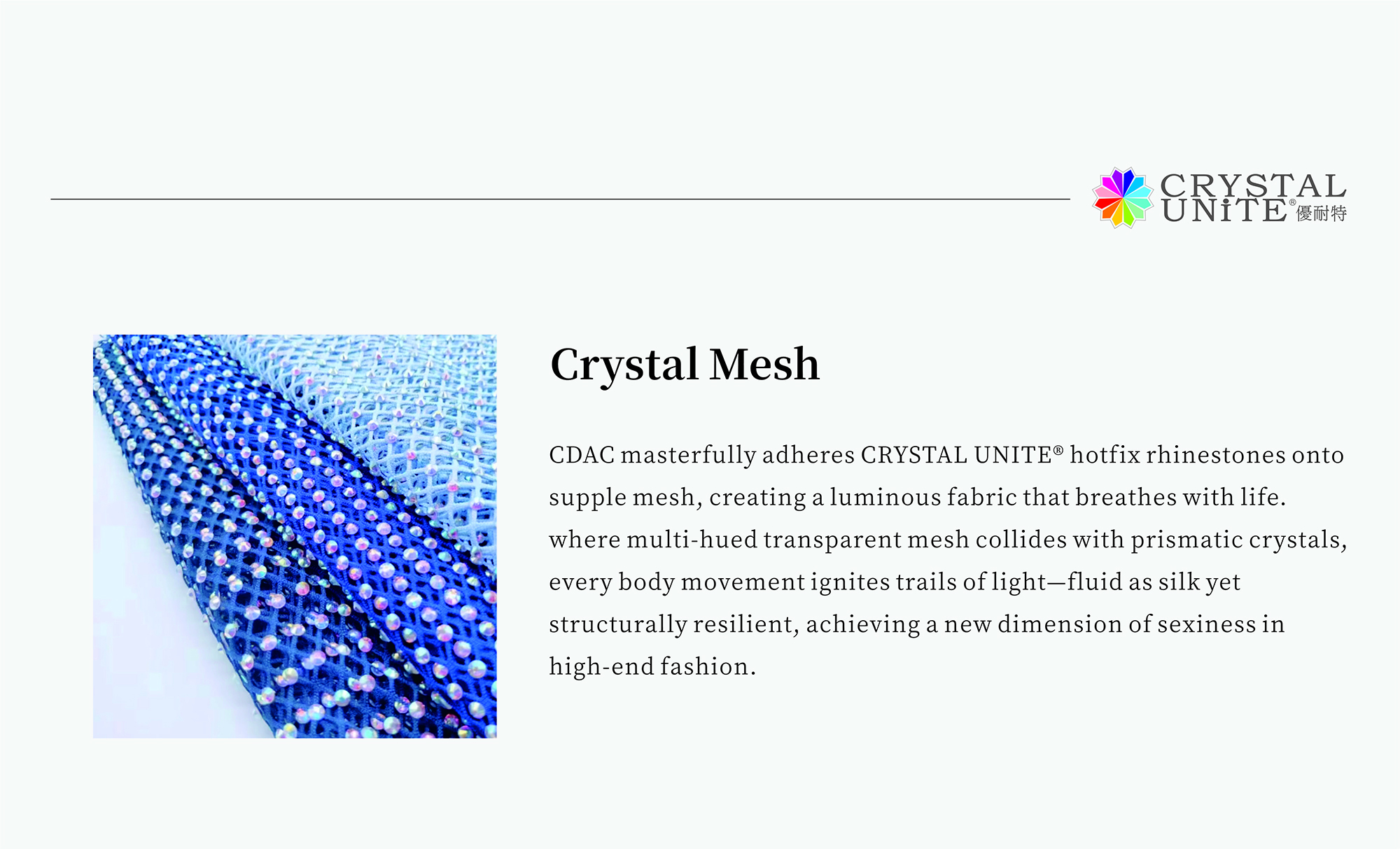 CDAC masterfully adheres Crystalunite® hotfix rhinestones onto supple mesh, creating a luminous fabric that breathes with life. Where multi-hued transparent mesh collides with prismatic crystals, every body movement ignites trails of light - fluid as silk yet structurally resilient, achieving a new dimension of sexiness in high-end fashion.