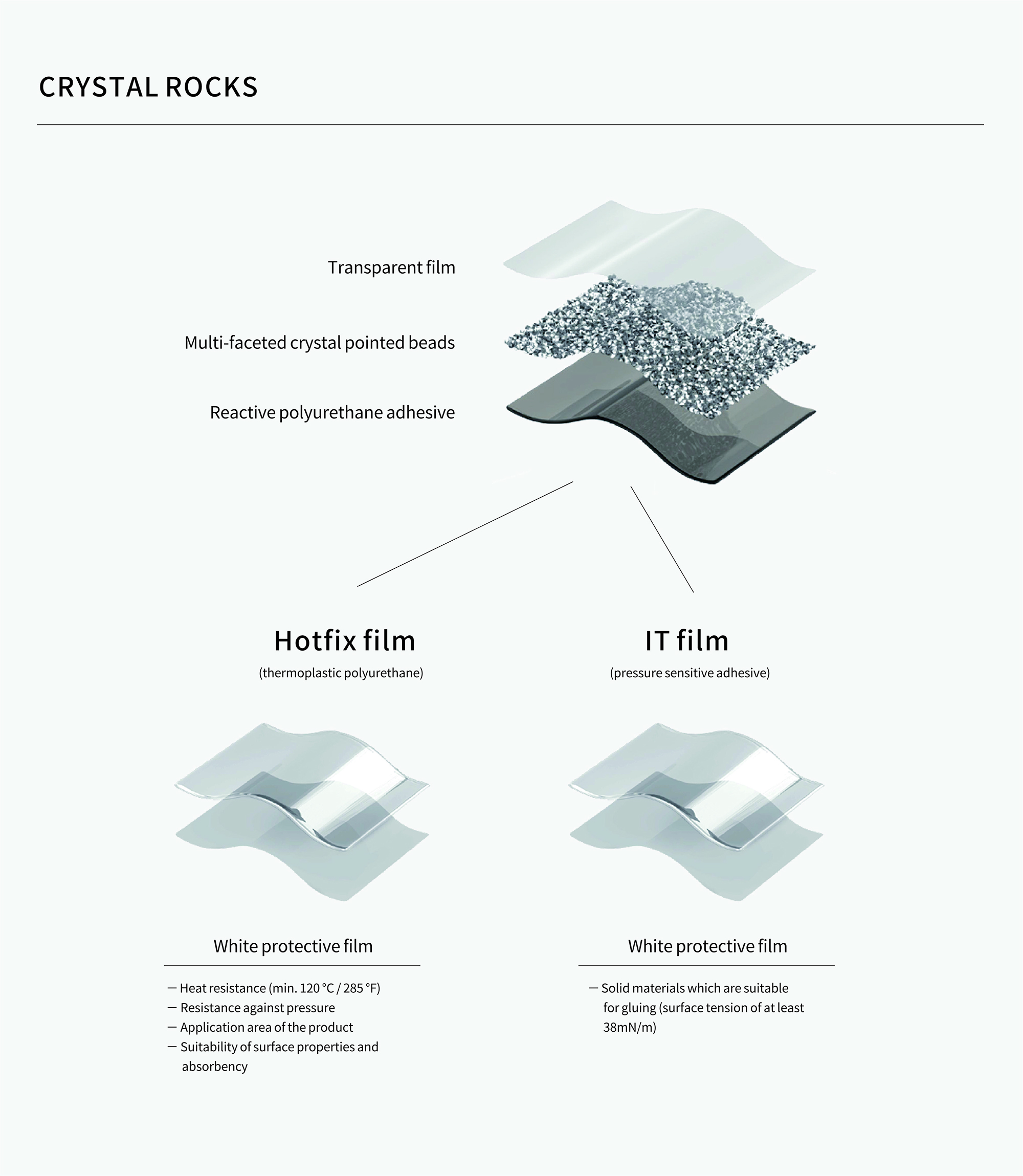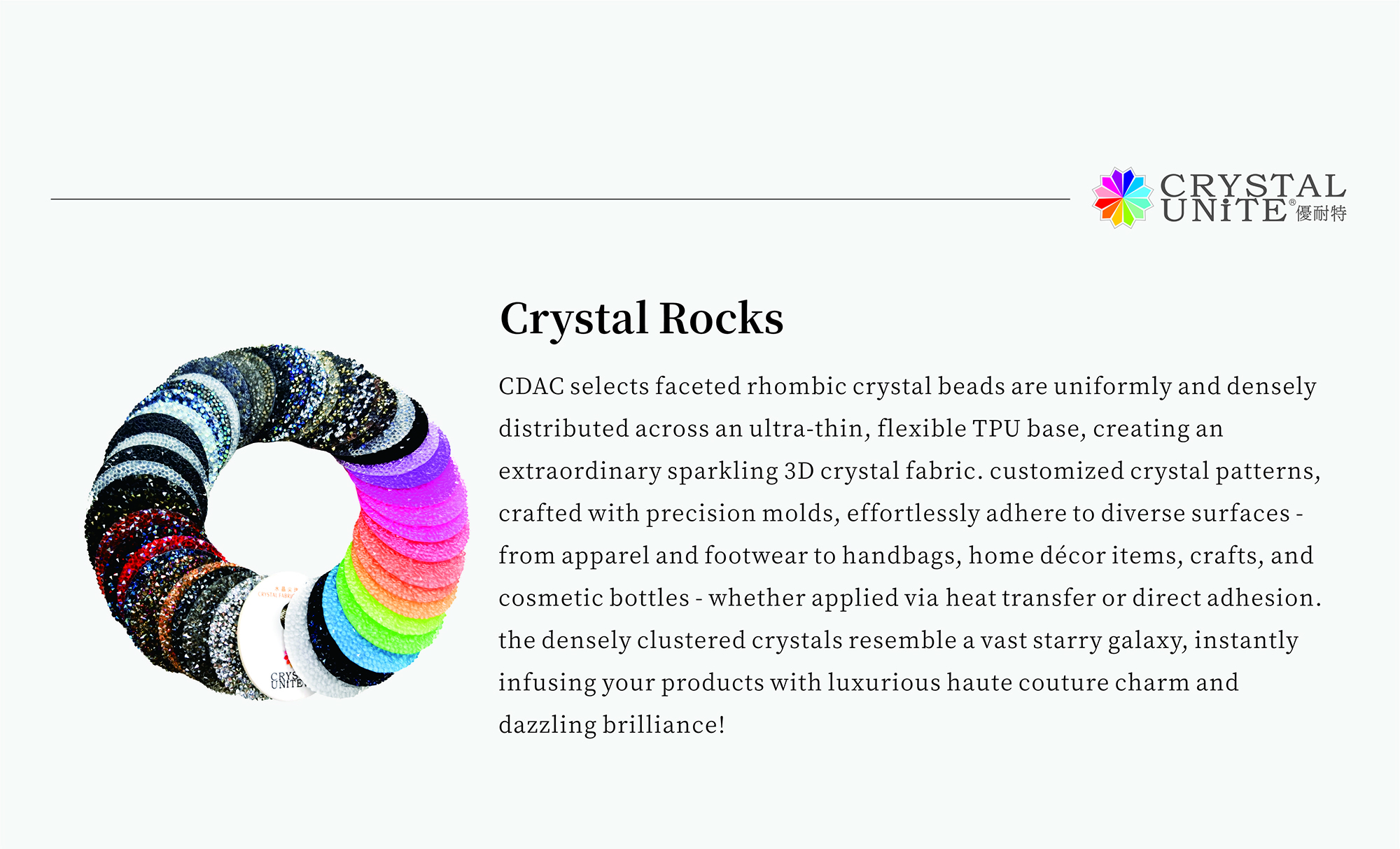 CDAC selects tiny crystal round beads and sparkling faceted crystal beads are evenly and densely distributed on an ultra-thin and flexible TPU substrate, achieving an extraordinary sparkling crystal fabric. Custom patterns can be precisely cut by laser. Apparel, footwear, handbags, and home decor items can be upgraded with heat transfer or direct application, effortlessly enhancing texture and infusing your products with haute couture-like crystal allure!