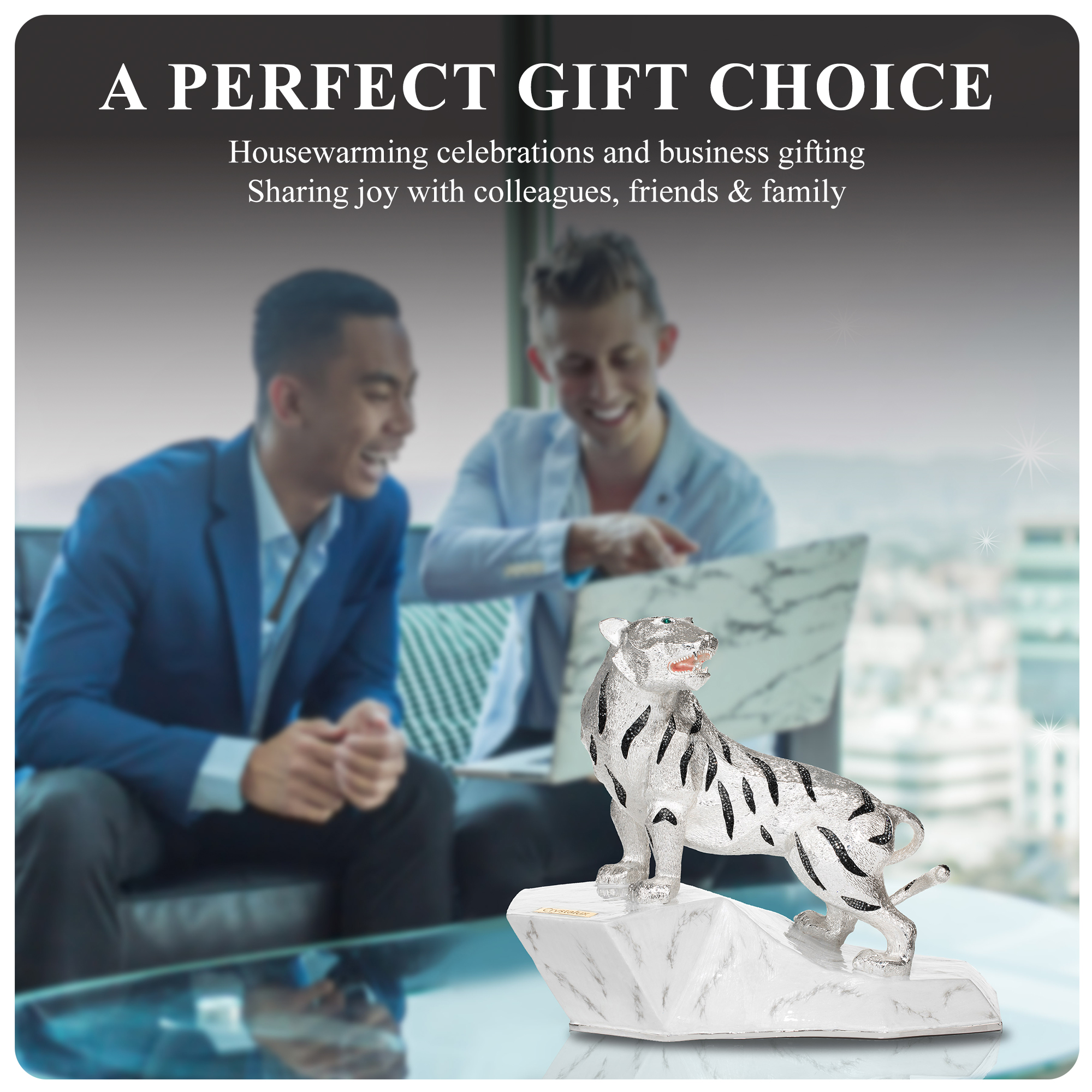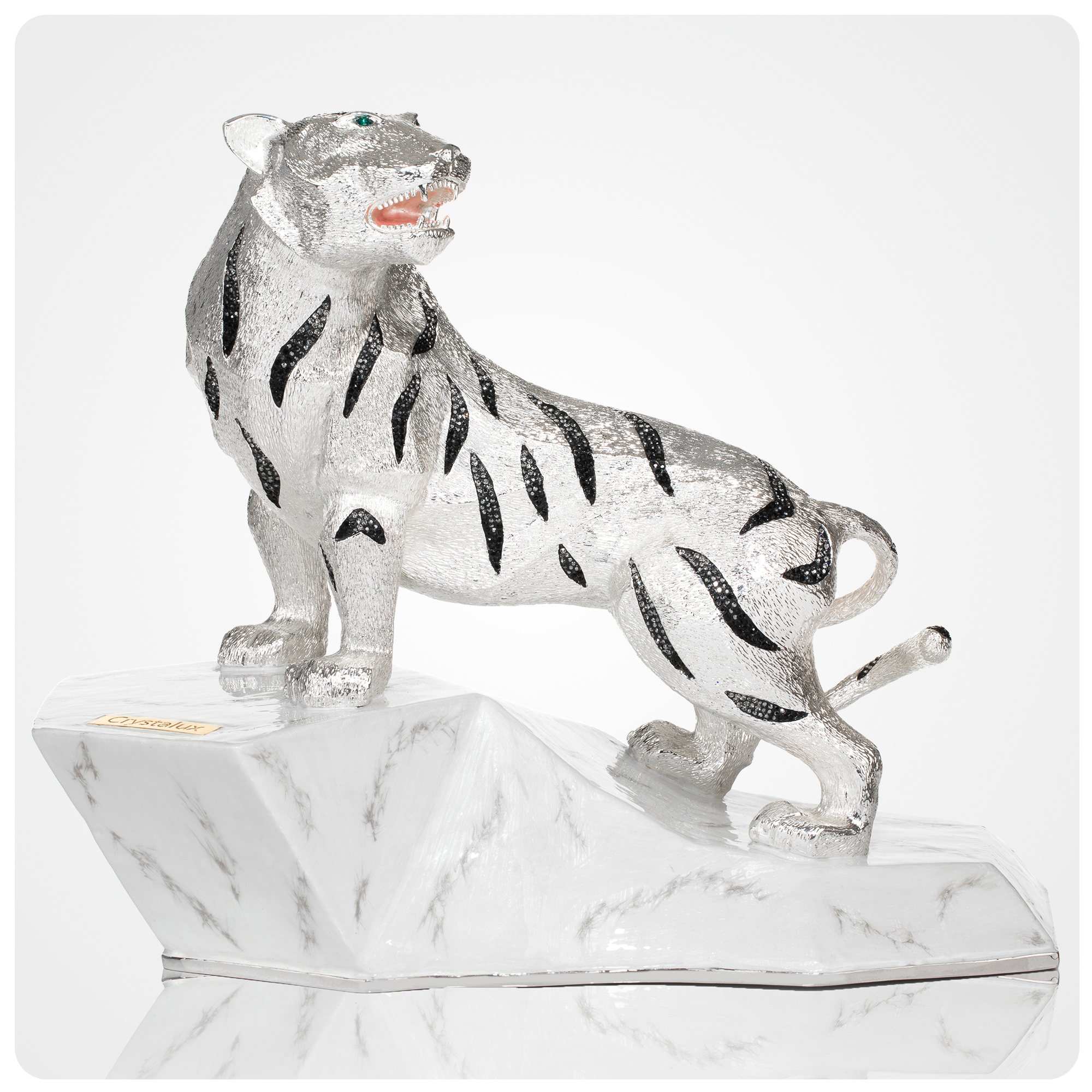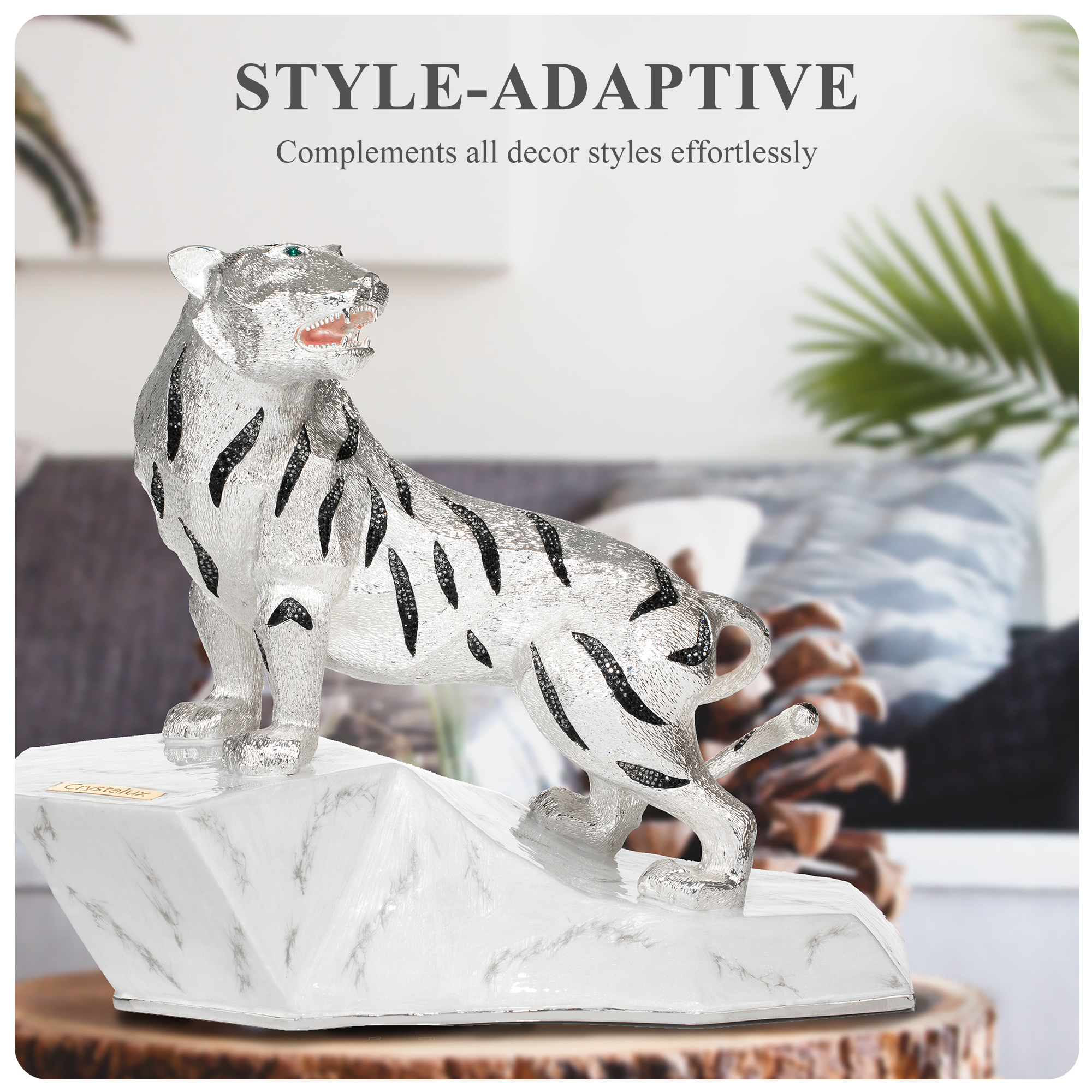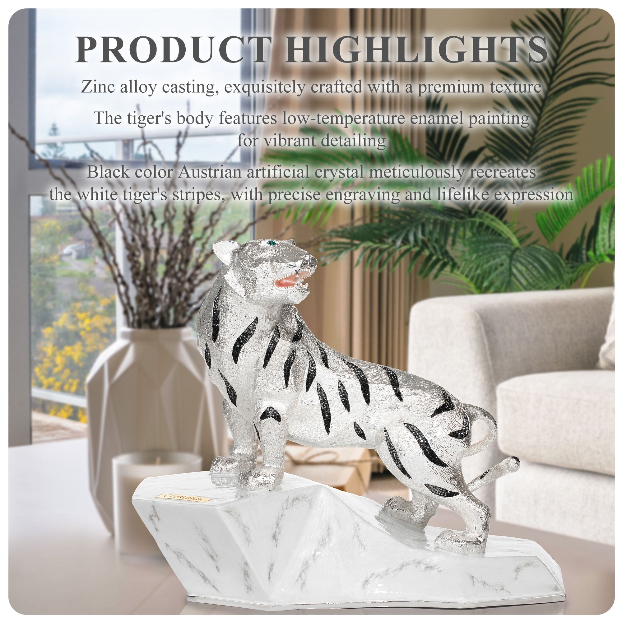 A contemporary cut white tiger sculpture crafted in premium metal, fully encrusted with precision-cut Swarovski-inspired artificial crystals.
