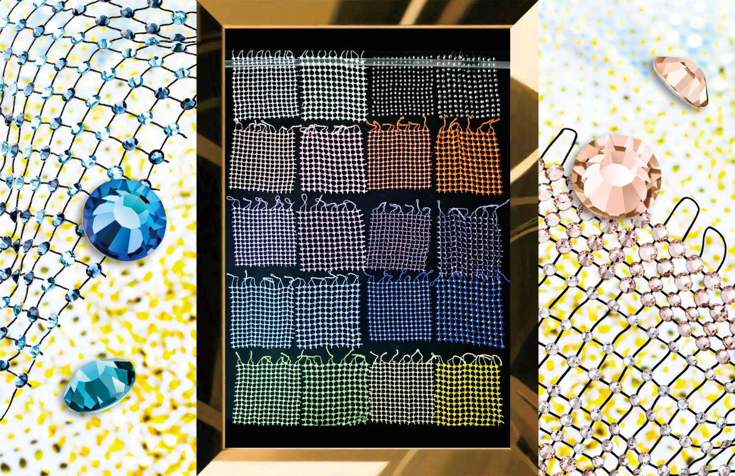 A crystal mesh is a netted material meticulously woven with crystals and elastic fibers.