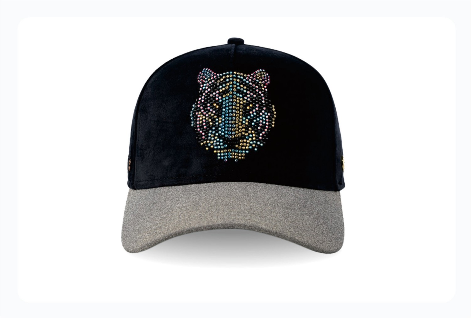 The black cap body adorned with a crystal-embellished fierce tiger motif contrasts sharply with the ash-toned brim,